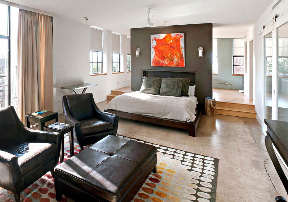 พื้นที่ห้องนอนในห้องสตูดิโอสามารถแยกออกจากกันได้โดยใช้ผ้าม่าน