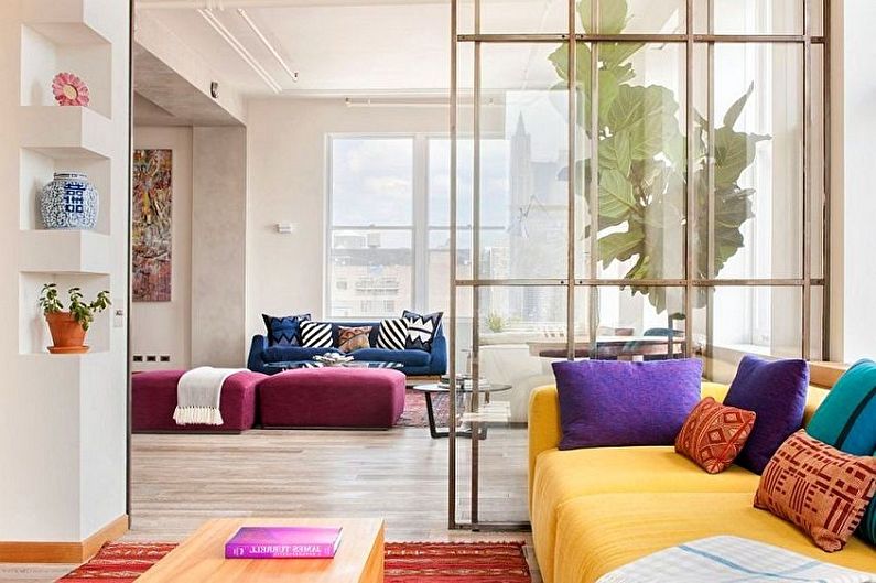 สำหรับพาร์ติชั่นพวกเขามีความหลากหลายมาก พาร์ทิชัน Drywall มีน้ำหนักเบามากและไม่กดบนพื้น ฉากกั้นทำจากไม้ติดตั้งง่าย แต่ราคาจะเพิ่มขึ้น บล็อคโฟมเหมาะสำหรับอพาร์ทเมนท์ที่กว้างขวางประโยชน์ที่ยอดเยี่ยมของพวกเขาคือเป็นมิตรต่อสิ่งแวดล้อม ฉากกั้นห้องทำจากกระจกไม่ทำให้ห้องหนักเพราะมันสะท้อนแสงได้ดี