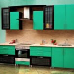 การออกแบบห้องครัวในโทนสีเขียวต่างๆรวมกับสีดำดูมีสไตล์ราคาแพง ด้านหน้าของชุดหูฟังแบบเคลือบมันดูดีเป็นพิเศษในความคมชัดนี้ ไม่แนะนำให้ใช้สีดำสำหรับห้องครัวโดยเฉพาะไม่ได้ใช้เป็นสีหลัก แต่เป็นสำเนียงที่ดึงดูดความสนใจจึงไม่สามารถถูกแทนที่ได้ เพื่อทำให้ห้องดูไม่โศกเศร้าให้เจือจางความเศร้าโศกด้วยสีที่อ่อนกว่า แต่องค์ประกอบการตกแต่งสีดำโต๊ะและเก้าอี้ผ้ากันเปื้อนดูเรียบร้อยเน้นความไร้ที่ติของเจ้าของ