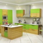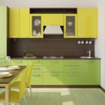 การผสมผสานที่ลงตัวสำหรับการตกแต่งคือสีเขียวกับสีเหลืองและด้วยเฉดสีน้ำตาล บรรยากาศจะเต็มไปด้วยความอบอุ่นความอบอุ่นและความสงบสุข ซุ้มมันวาวที่มีเม็ดมีดทำจากไม้ธรรมชาติดูเป็นต้นฉบับ แต่ผนังดังกล่าวไม่ถูกคุณสามารถไปในทางอื่นได้ - เปลี่ยนอุปกรณ์ทุกชนิด (เขียง, เครื่องเขย่าพริกไทย, เครื่องเขย่าเกลือ ฯลฯ ) ด้วยผลิตภัณฑ์ไม้ ชุดครัวสีเขียวจะ“ เล่น” ได้ดีบนพื้นที่มีแสงสว่างมากโดยมีพื้นหลังเป็นกำแพงสีน้ำตาล