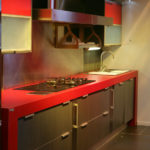 ชุดครัวมีลักษณะเป็นมันวาวโดยมีผนังด้านหน้าเป็นสีแดงและสีกลางๆ