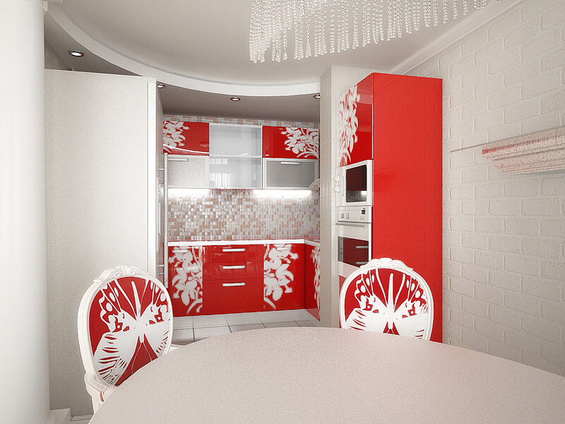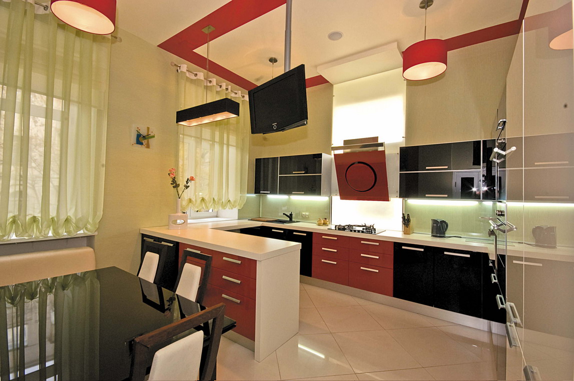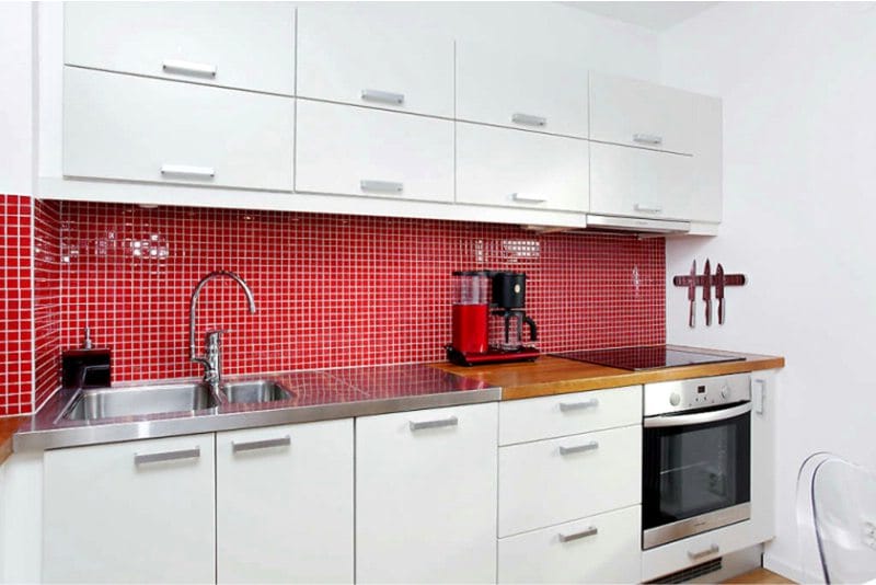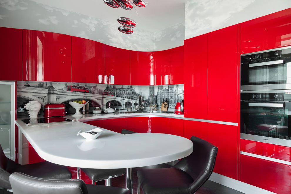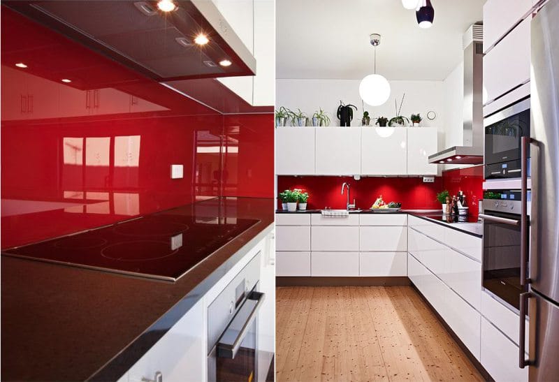 การออกแบบห้องครัวสีแดงไม่สามารถออกแบบโดยใช้เฉดสีแดงที่แตกต่างกันได้ มันเป็นสิ่งจำเป็นที่จะเจือจางการตกแต่งด้วยสีที่เหมาะสมอื่น ๆ