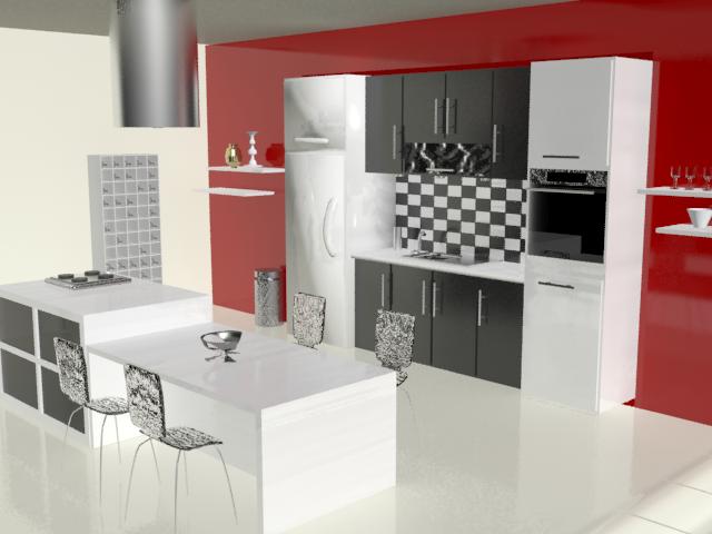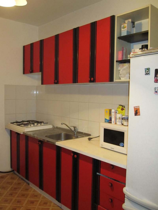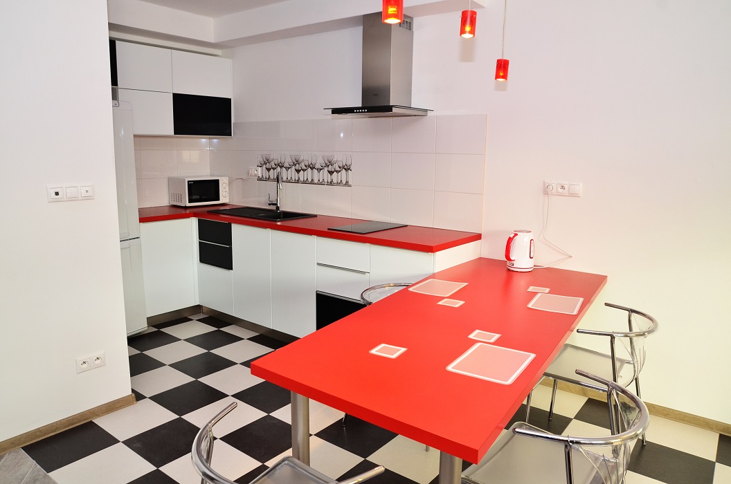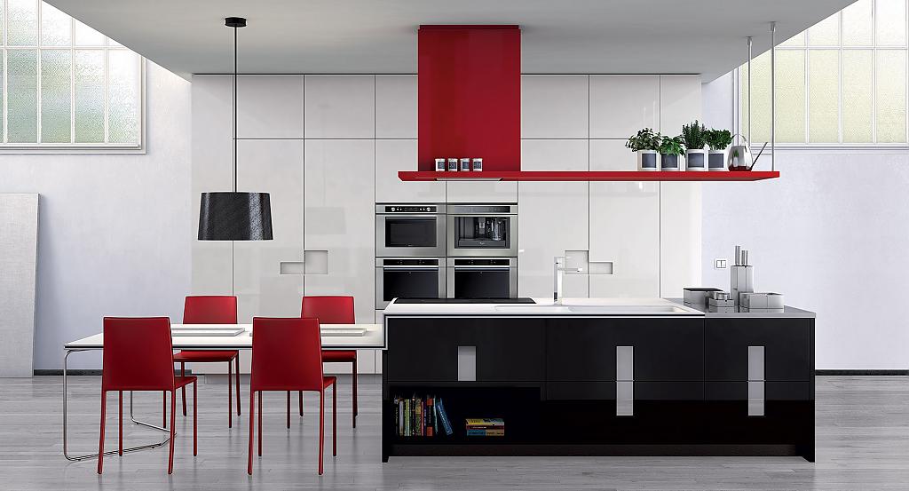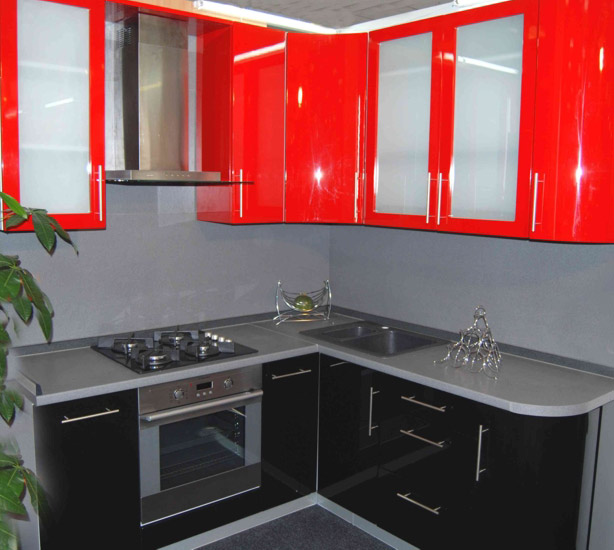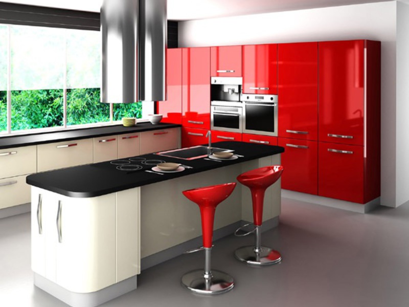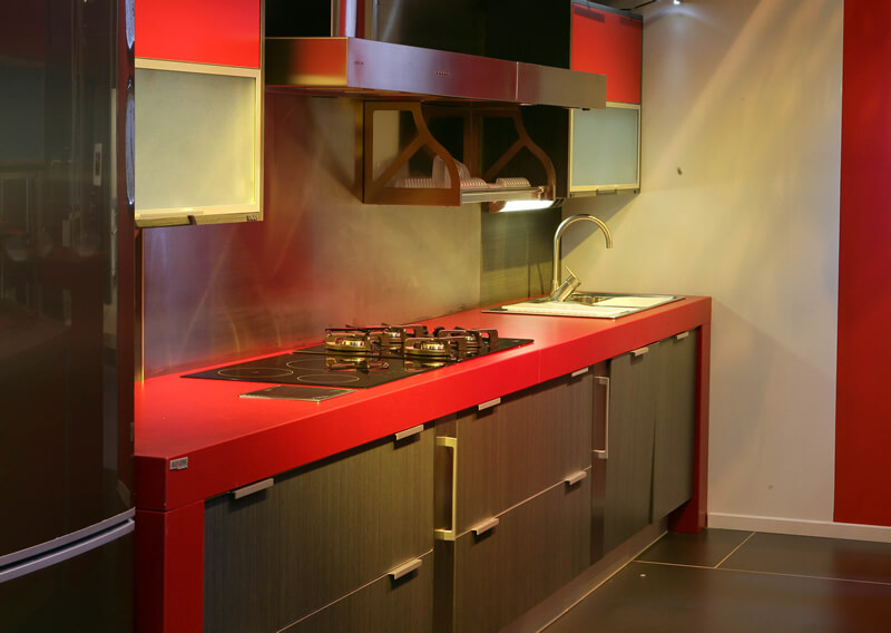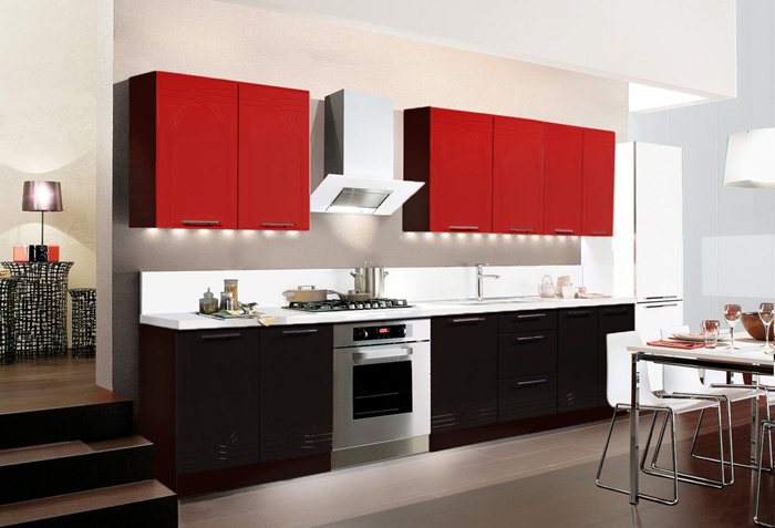ชุดครัวมีลักษณะเป็นมันวาวโดยมีผนังด้านหน้าเป็นสีแดงและสีกลางๆ