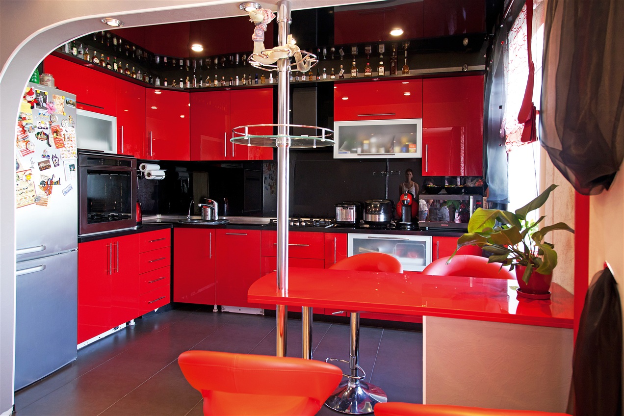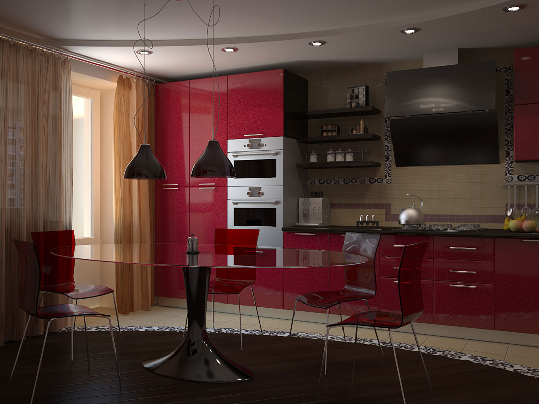 มีความอิ่มตัวมีสไตล์มีความหนาไม่สามารถใช้คำบรรยายทั้งหมดที่มีสีแดงได้ มันดูสวยงามในเสื้อผ้าอุปกรณ์เสริม แต่ก็มีผลบังคับใช้ในการตกแต่งภายใน หลายคนกลัวที่จะทดสอบและใช้เฉดสีที่หนานี้ในการตกแต่งภายในโดยเฉพาะในห้องครัว และไร้ประโยชน์ พื้นที่ห้องครัวที่ทำในพาเลตต์นั้นดูมีสไตล์และสวยงามมาก