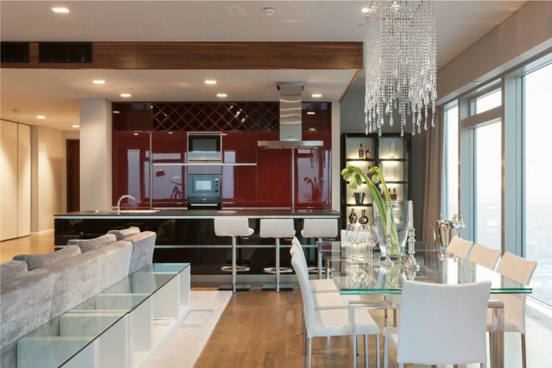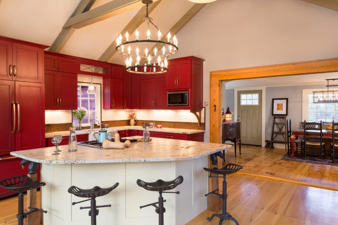 หากคุณยังต้องการใช้โทนสีแดงเข้ม แต่ห้องมีขนาดเล็กเกินไปคุณสามารถเลือกสีแดงสำหรับองค์ประกอบเฟอร์นิเจอร์บางอย่างเท่านั้น ครัวด้านหน้าใช้พื้นที่มากเกินไปพวกเขาจะไม่พอดี แต่เก้าอี้ที่มีเก้าอี้บนพื้นหลังสีอ่อนจะดูสวยงามมาก