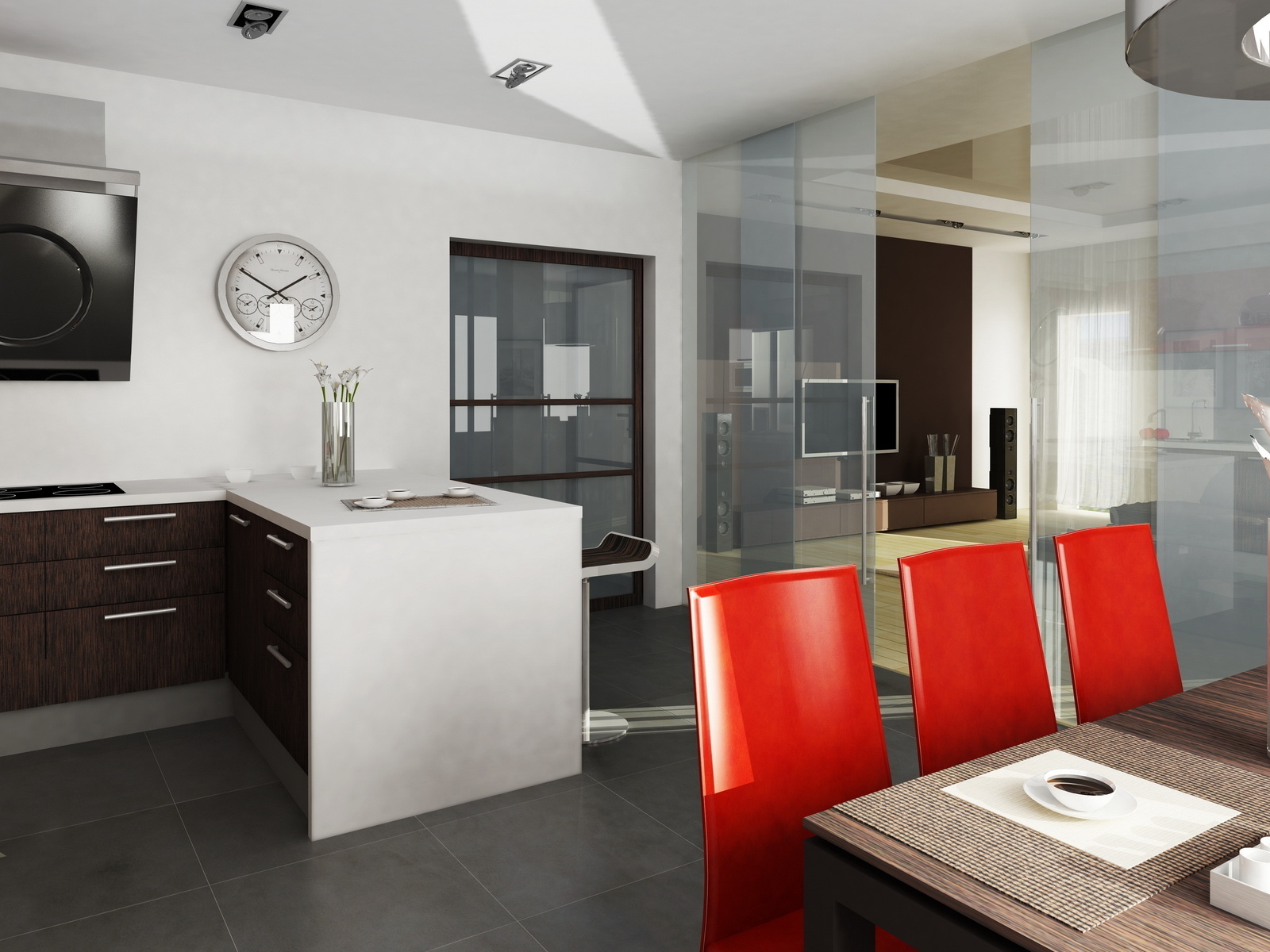 มันกลายเป็นห้องดั้งเดิมมากเสร็จในสีขาวเท่านั้นรวมกับโต๊ะอาหารและเก้าอี้สีแดงฉ่ำ เอฟเฟกต์แบบเดียวกันนี้เกิดจากการใช้สีเทาดำทำให้เกิดบรรยากาศที่มืดมน