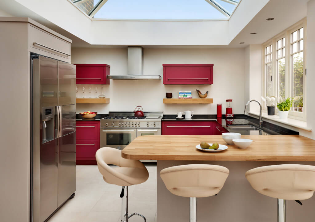 การรวมกันของชุดหูฟังสีขาวและผนังสีแดงในห้องครัวมีสไตล์และสดใสให้ความรู้สึกกว้างขวางและสดชื่น