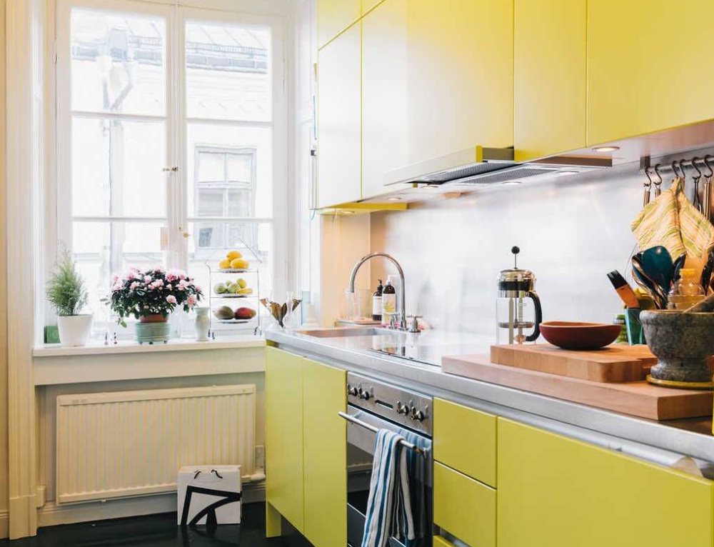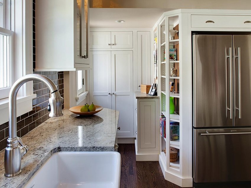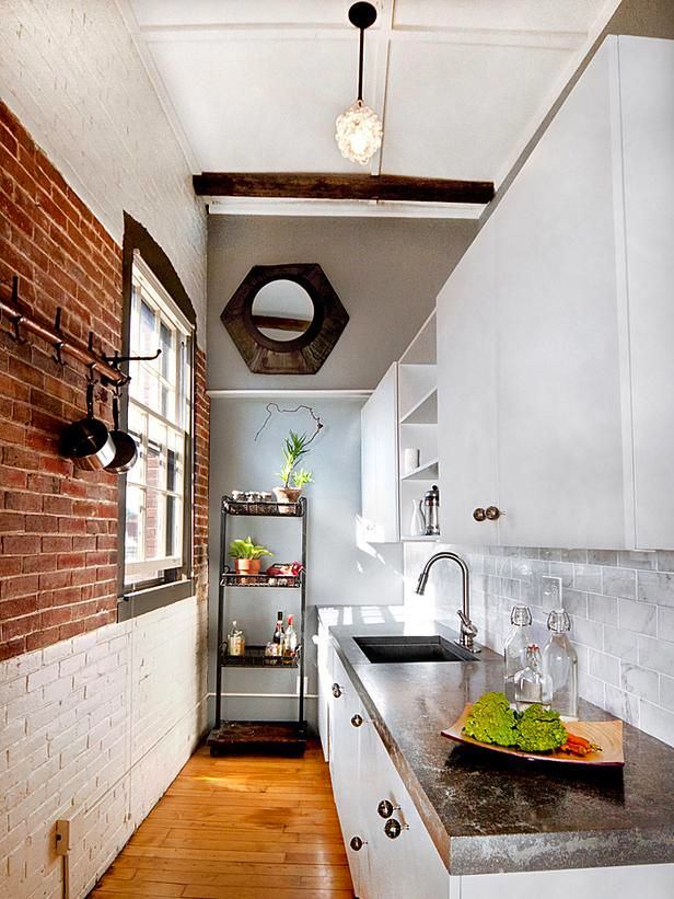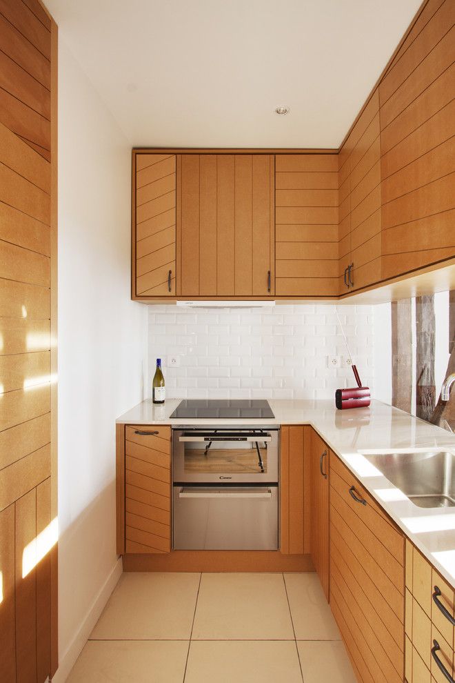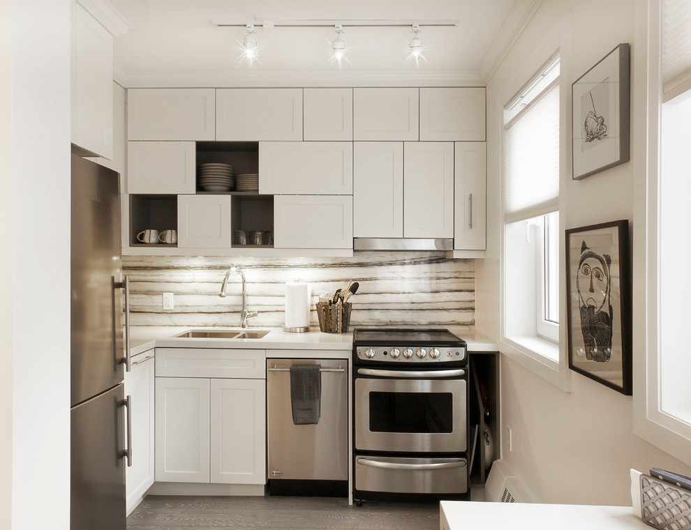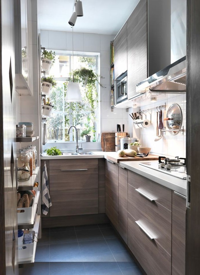 ในคำถามของวิธีการจัดเตรียมห้องครัวถ้ามันมีขนาดเล็กหรือแคบนี่เป็นหนึ่งในหลักการสำคัญ ตัวอย่างเช่นเตาอบขนาดใหญ่สามารถถูกแทนที่ด้วยรูปแบบไมโครเวฟที่ทันสมัยในตัว เลือกเครื่องซักผ้าหรือเครื่องล้างจานแคบ ๆ และซ่อนไว้ในเฟอร์นิเจอร์ครัวในขณะที่กาต้มน้ำไฟฟ้าหรือเครื่องชงกาแฟสามารถวางบนชั้นแขวนผนัง