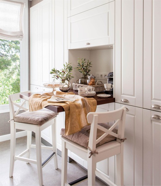 การเตรียมครัวให้มีพื้นที่ จำกัด นั้นยากกว่าเสมอ หนึ่งในแนวคิดยอดนิยมและทันสมัยที่สุดคือการจัดเตรียมพื้นที่รับประทานอาหารนอกห้องครัว เป็นตัวเลือกใช้ระเบียงโดยที่เปิดจากห้องครัว