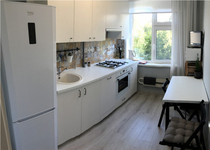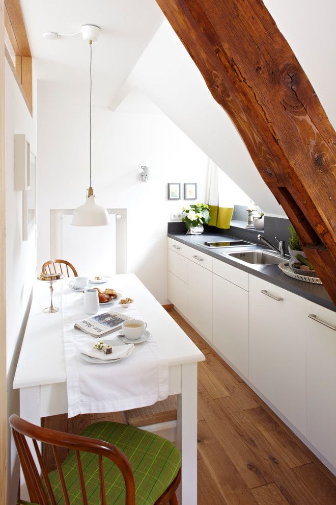 ในห้องครัวแคบควรวางชุดเชิงเส้นตามผนังด้านหนึ่ง แต่ให้วางเคาน์เตอร์บาร์ที่สามารถเปลี่ยนโต๊ะรับประทานอาหารแทน