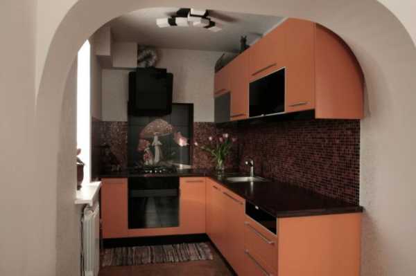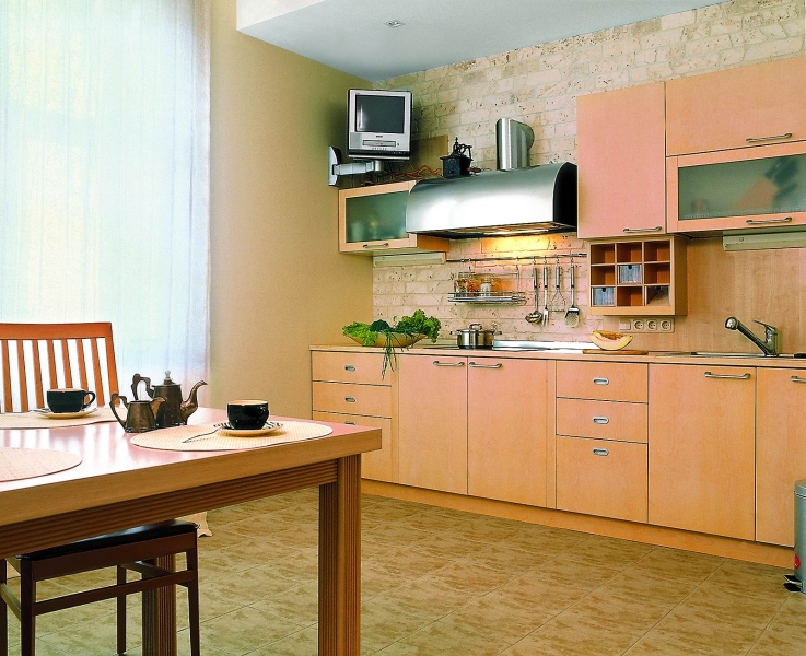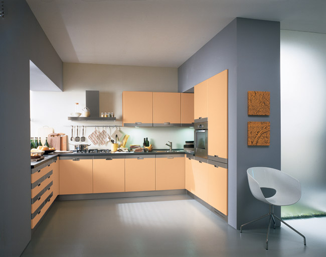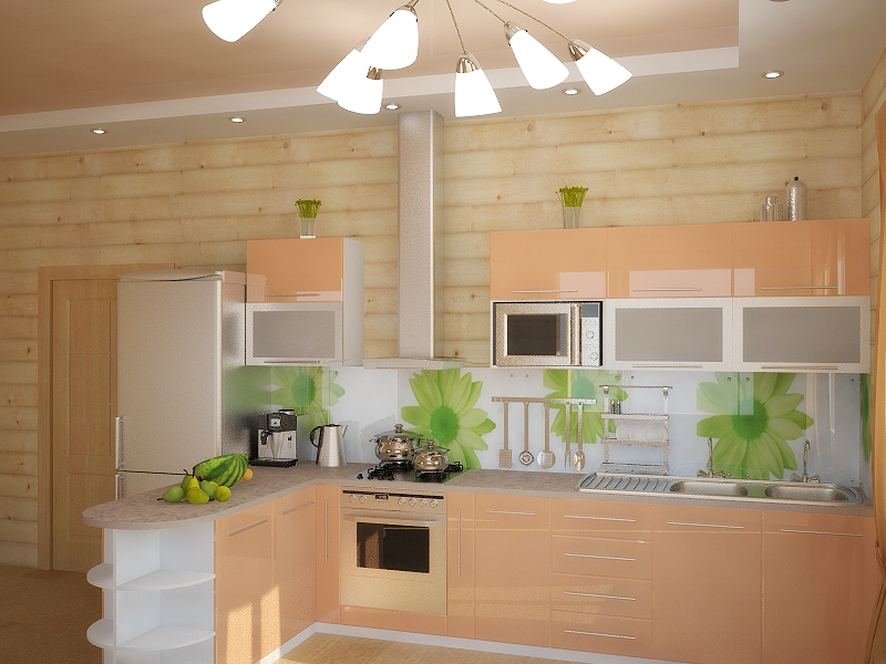 สีพีชสามารถเพิ่มขนาดของห้องครัวได้ด้วยสายตา แต่ให้แสงสว่างดีเท่านั้น
