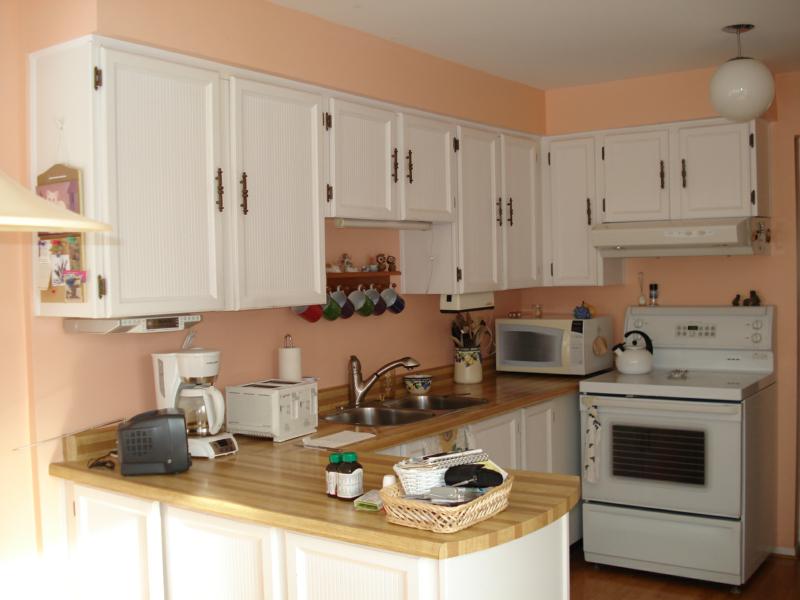 หากคุณต้องการสร้างบรรยากาศที่ผ่อนคลายในห้องครัวให้ผนังสีพีชและเลือกชุดสีขาวหรือสีน้ำนม