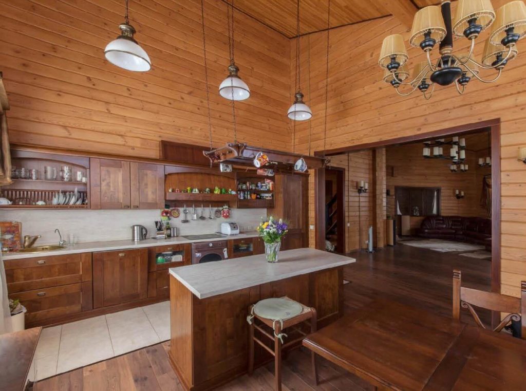 การผสมผสานที่ลงตัวระหว่างไม้สีเข้มกับชุดครัวสีขาว