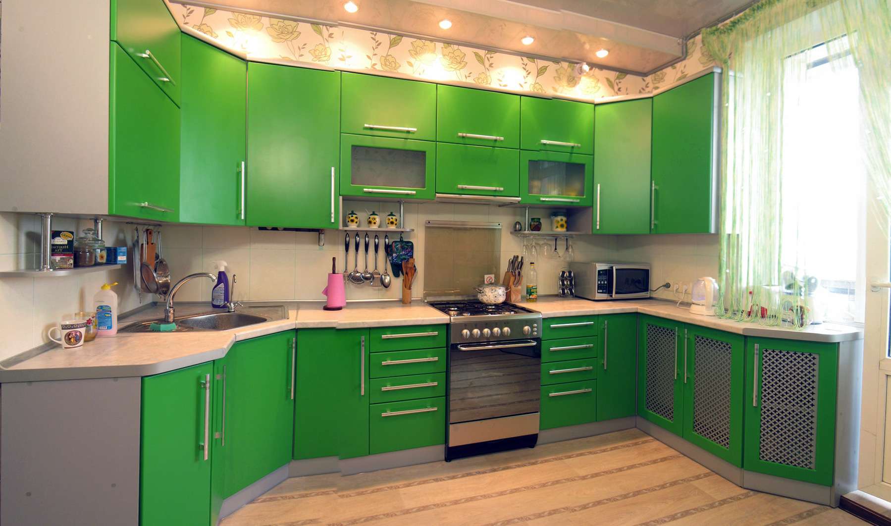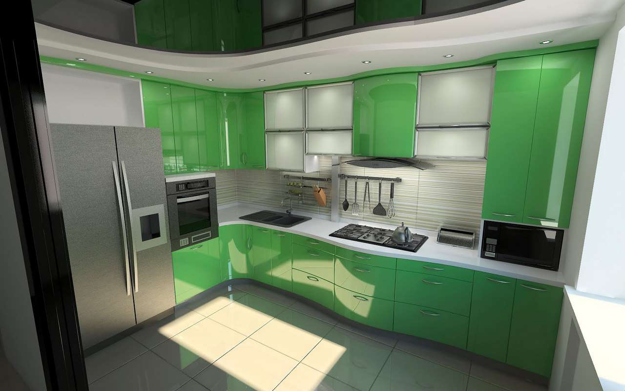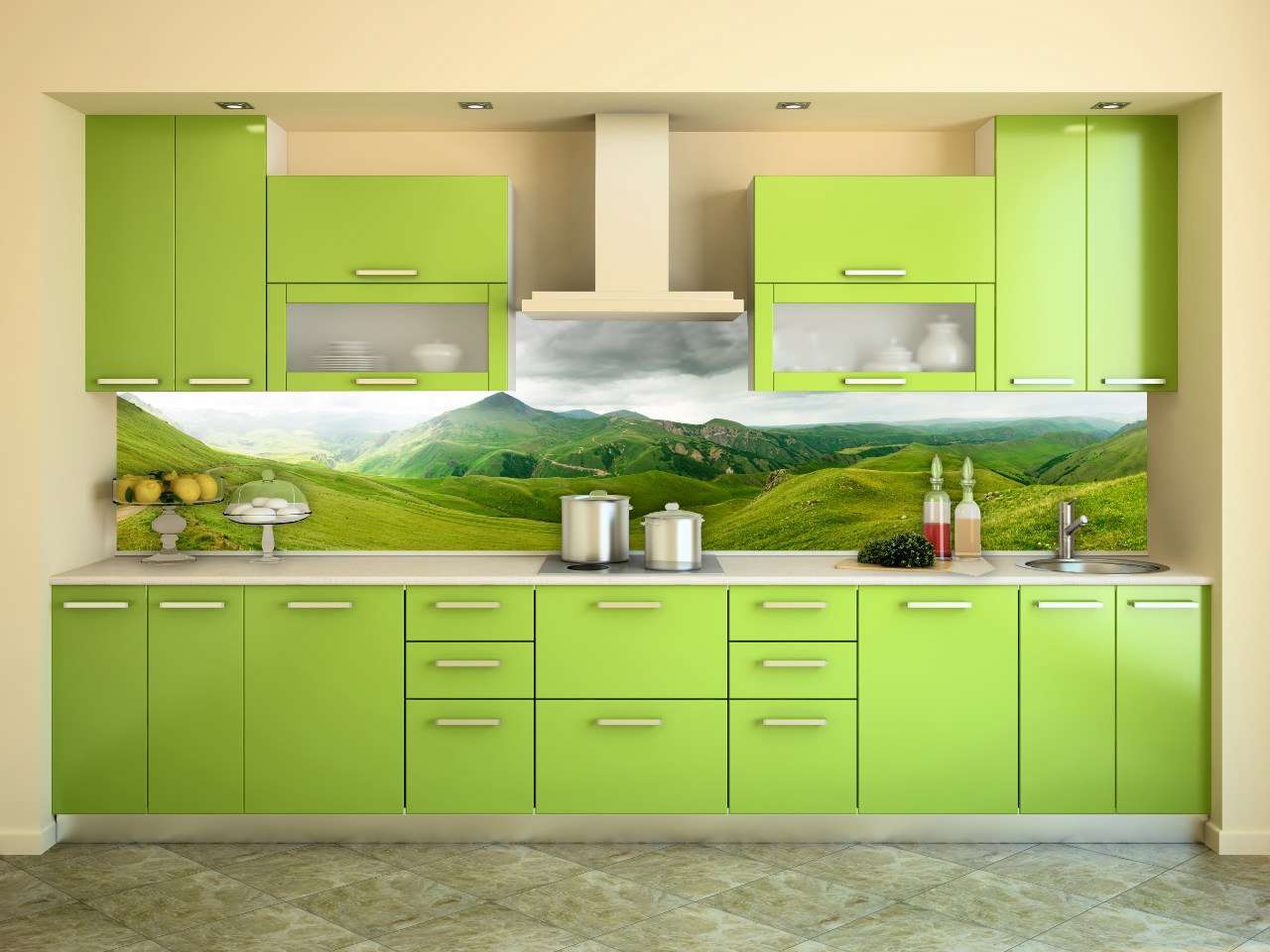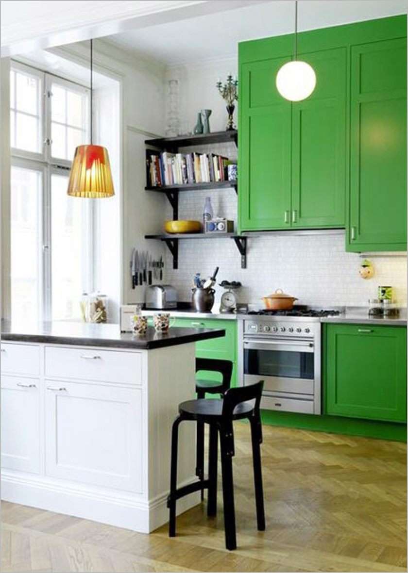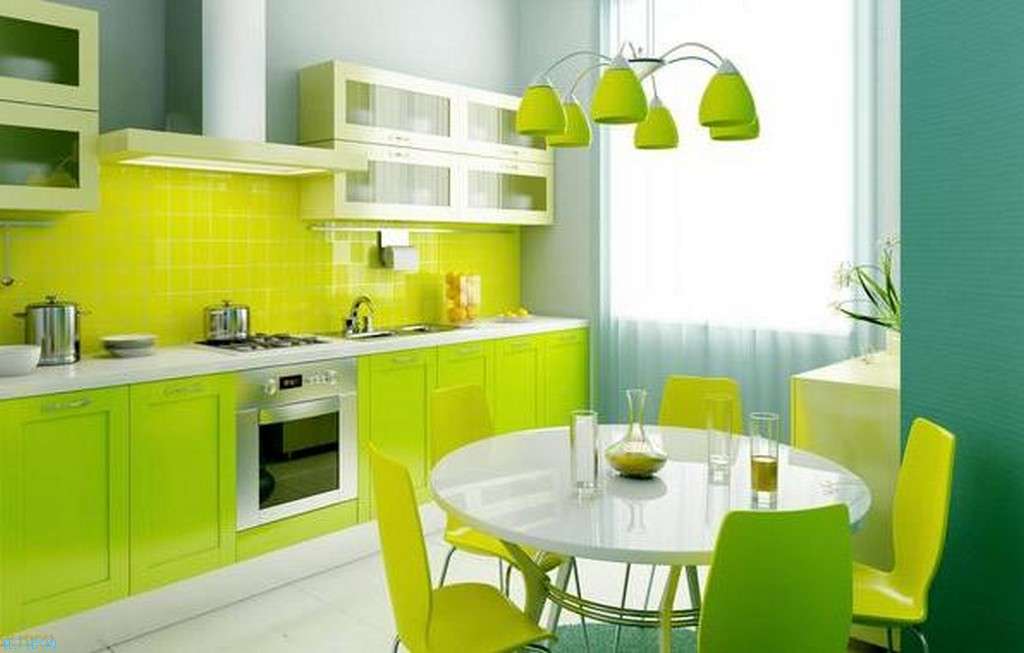 สีที่ผ่อนคลายและมีชีวิตชีวามีคุณสมบัติที่เป็นเอกลักษณ์ ในตอนเช้าห้องครัวสีเขียวจะช่วยให้คุณตื่นขึ้นมาเร็วขึ้นและเติมพลังงานด้วยตลอดทั้งวัน ในช่วงเย็นจะช่วยให้คุณผ่อนคลายสงบลง