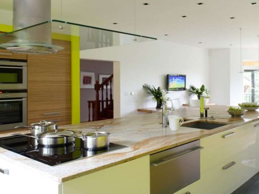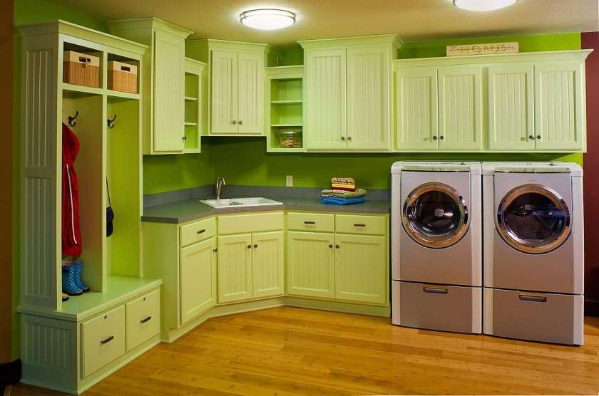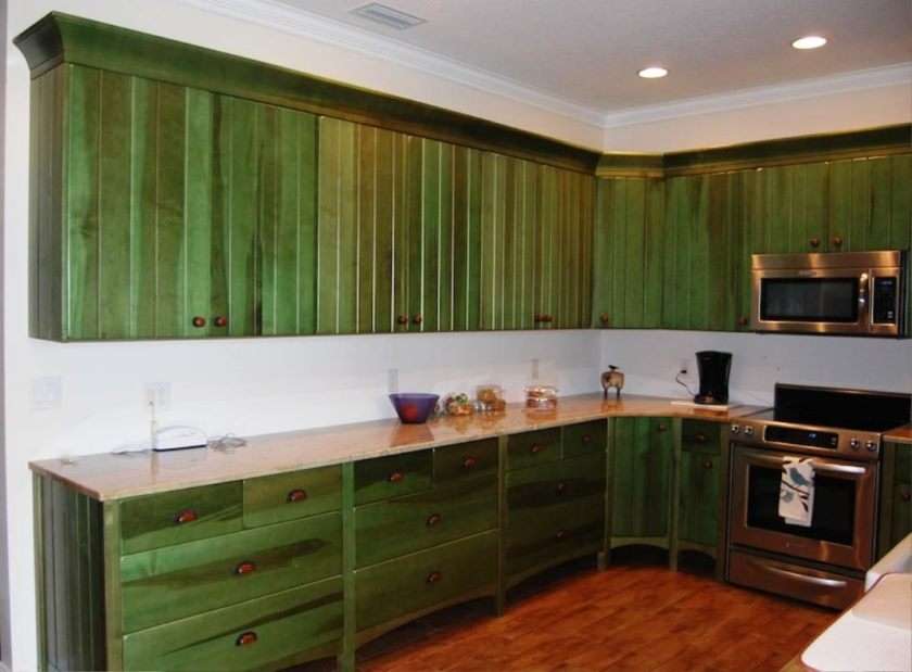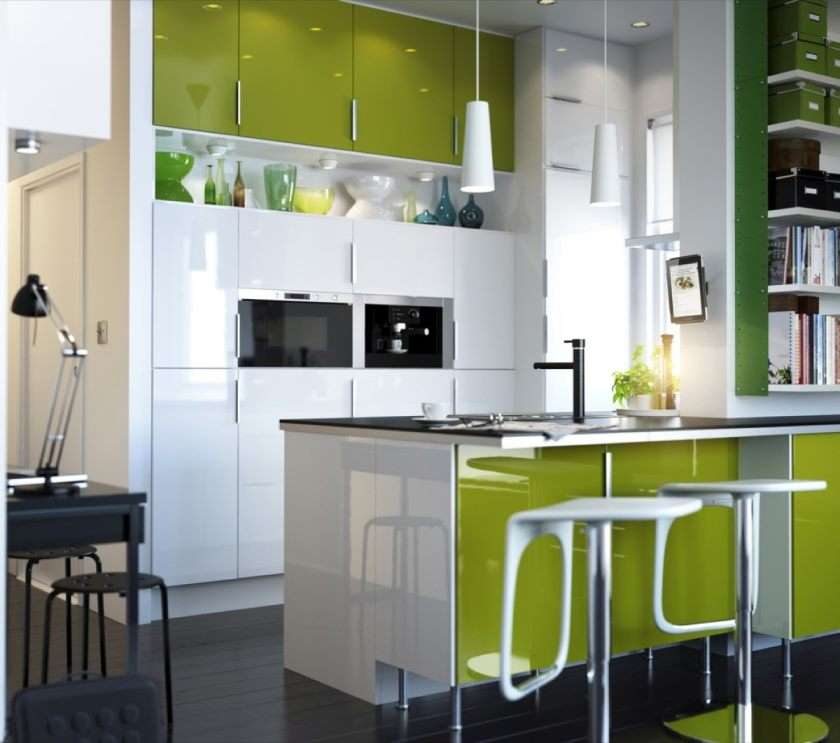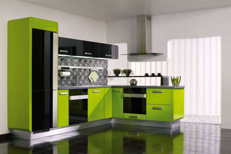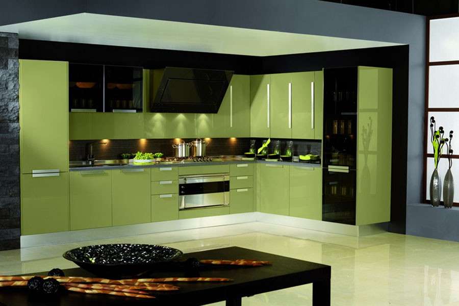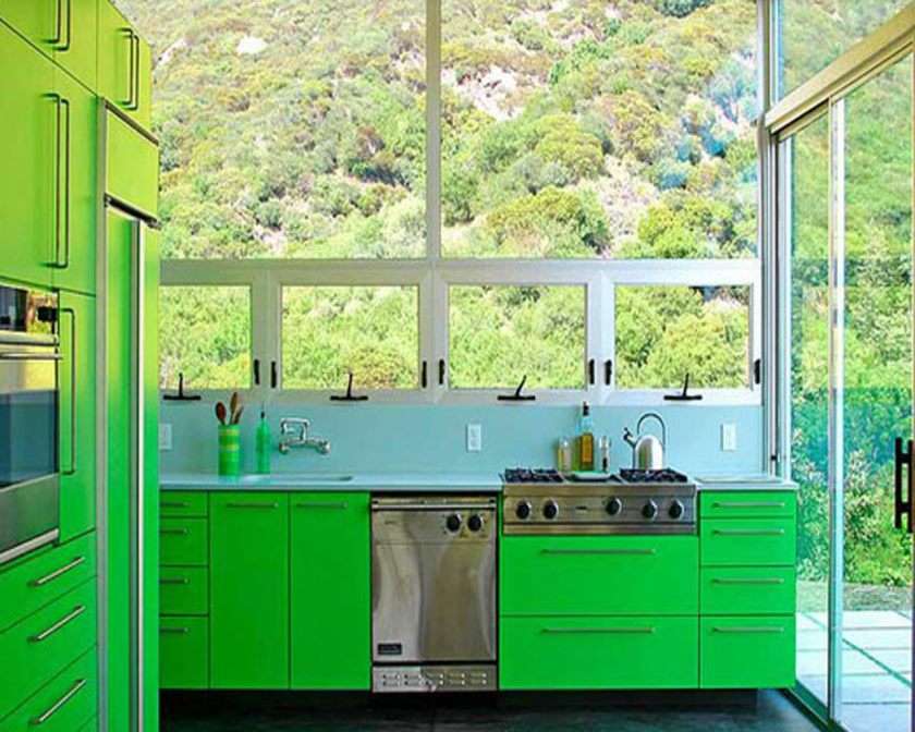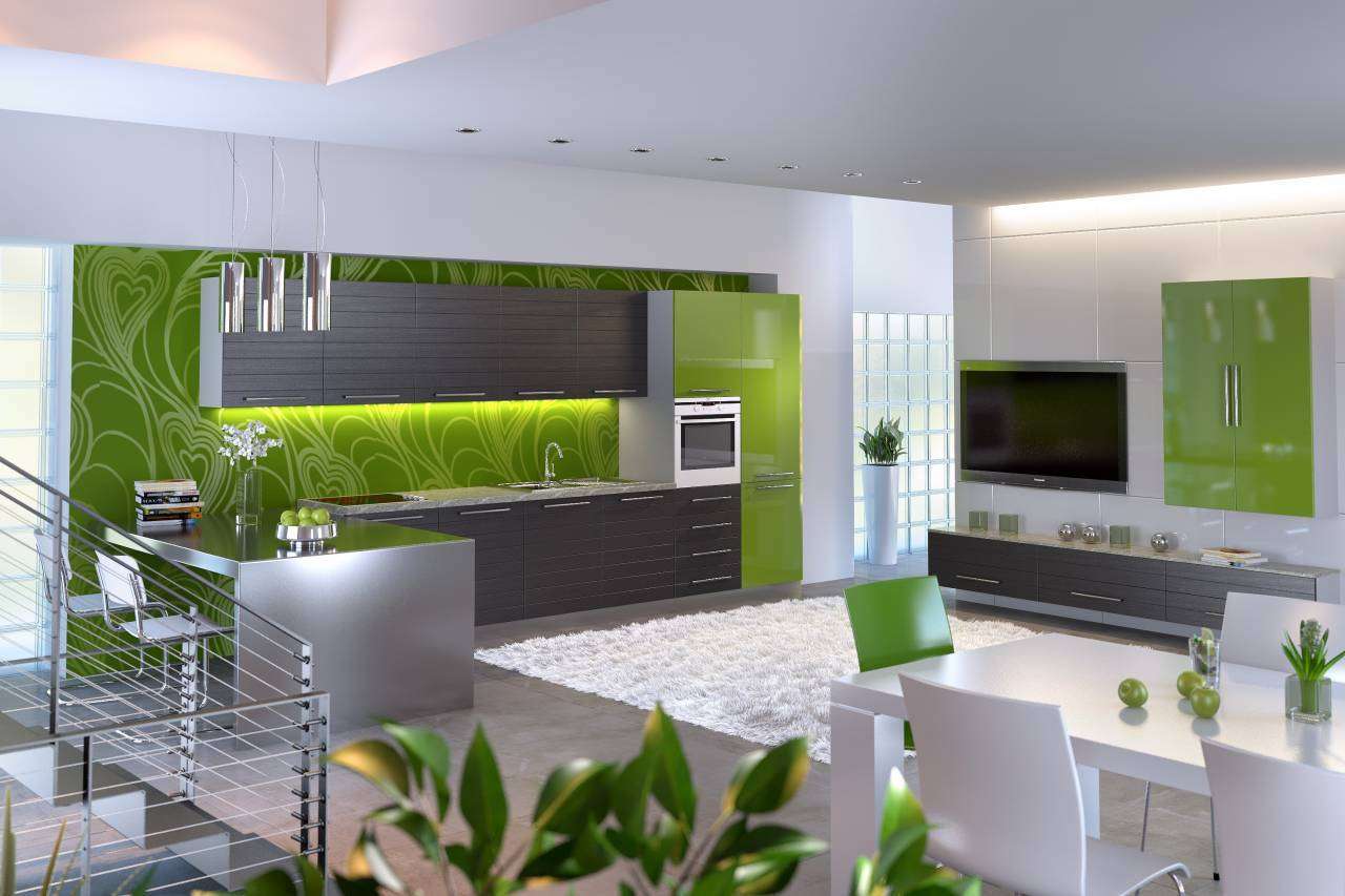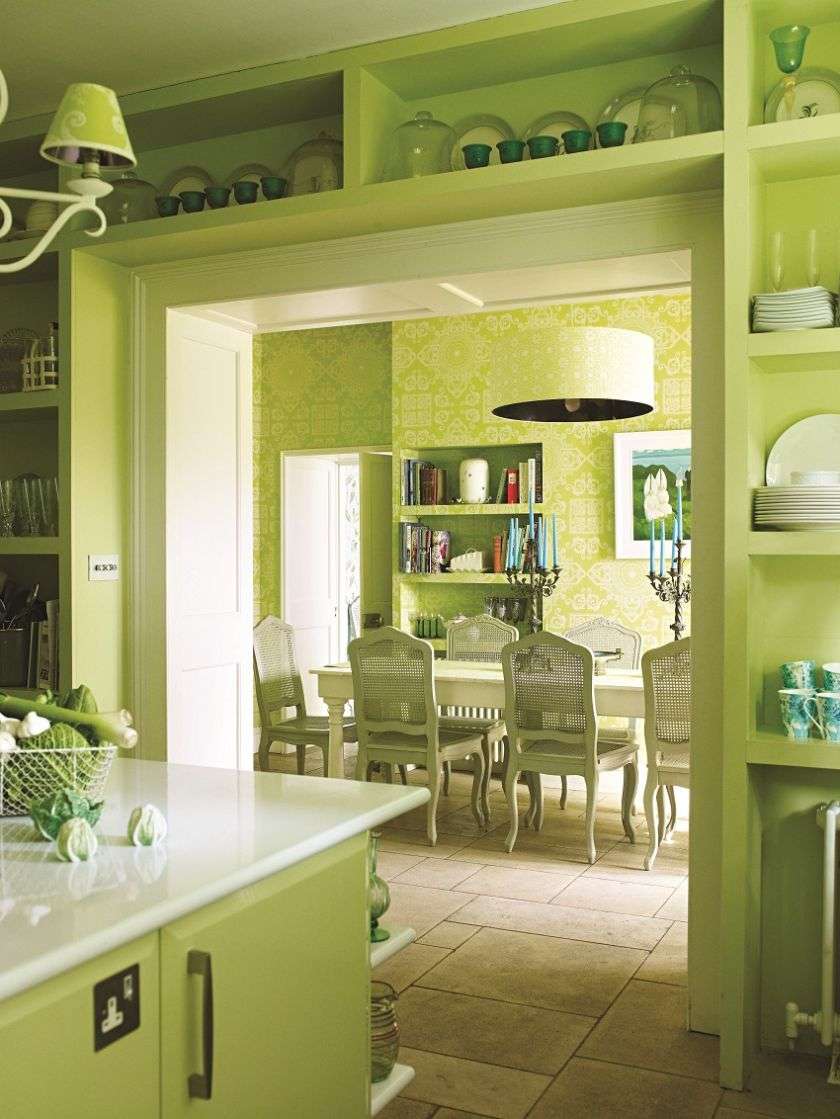 สีเขียวในการตกแต่งภายในมักจะถูกใช้โดยนักออกแบบในการพัฒนาโครงการของพวกเขา มันสร้างบรรยากาศที่สงบเงียบสงบช่วยในการปรับในทางบวกและผ่อนคลายหลังจากวันที่ยากลำบาก เฉดสีที่ลึกและอิ่มตัวของสีนี้ช่วยเพิ่มความเข้มข้นและกิจกรรมทางจิตใจยกระดับความสดใสช่วยให้สงบลง เมื่อนึกถึงการออกแบบครัวสีเขียวสีนี้สามารถใช้เป็นหลักหรือการออกแบบเพิ่มเติมได้ สีเขียวผสมผสานอย่างลงตัวกับพันธุ์และตัวแทนอื่น ๆ ของจานสี