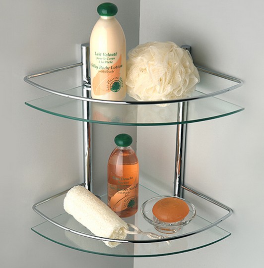 มุม - นี่คือสถานที่ที่ไม่สามารถใช้งานได้ตลอดเวลา อย่างไรก็ตามด้วยความช่วยเหลือของชั้นวางพิเศษคุณสามารถเปลี่ยนพวกเขาเป็นสถานที่ปฏิบัติสำหรับการจัดเก็บอุปกรณ์อาบน้ำ เนื่องจากรูปร่างและขนาดของมันจึงไม่ทำให้มีพื้นที่มากเกินไป