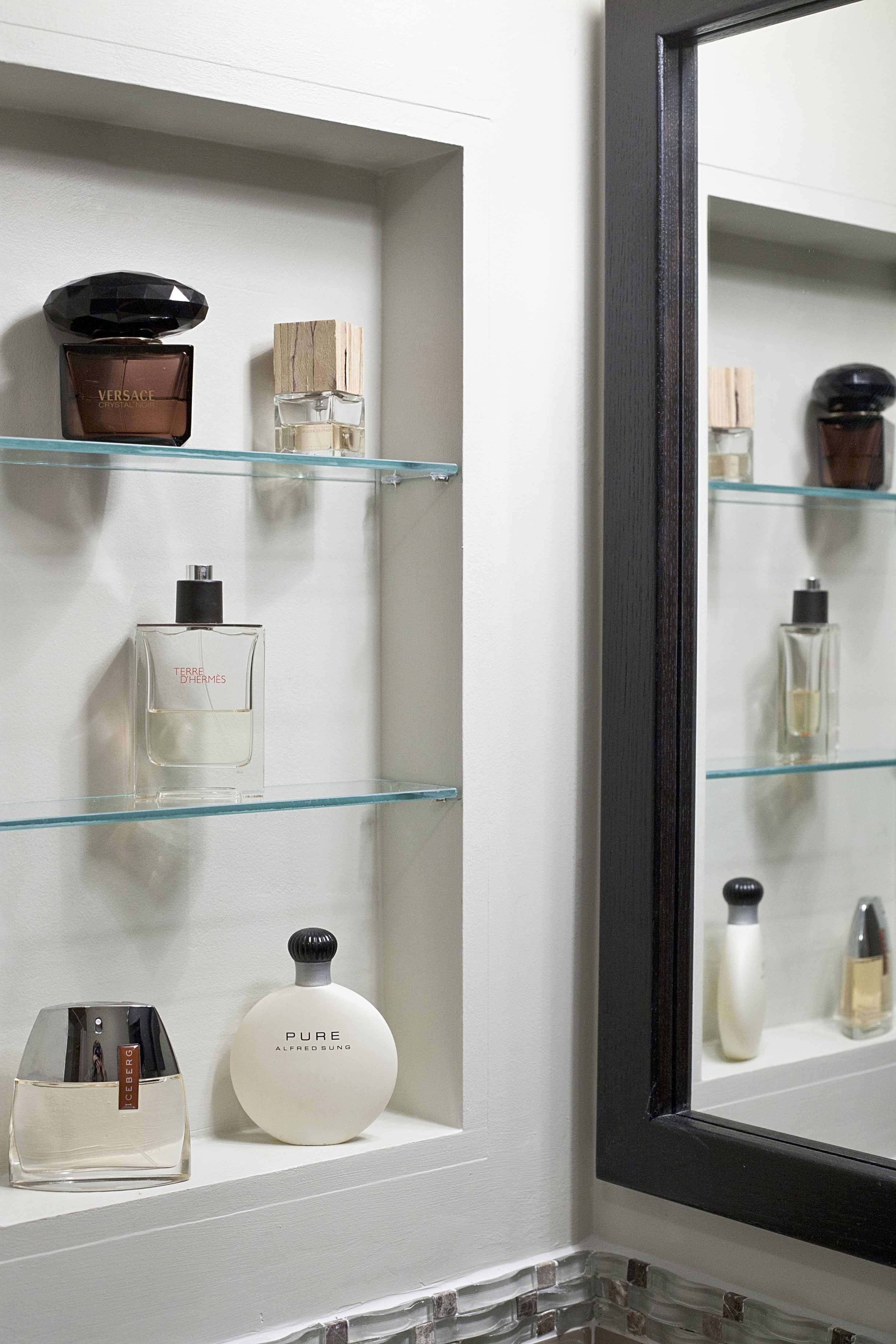ชั้นวางกระจกครอบครองพื้นที่แยกต่างหากซึ่งลงตัวกับการตกแต่งภายในในเกือบทุกสไตล์