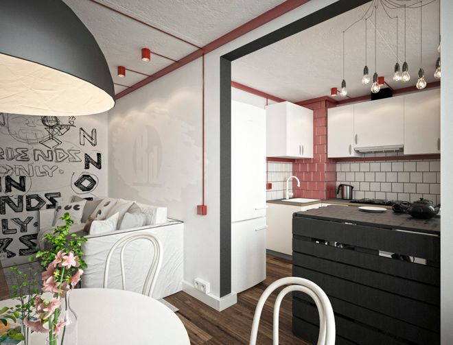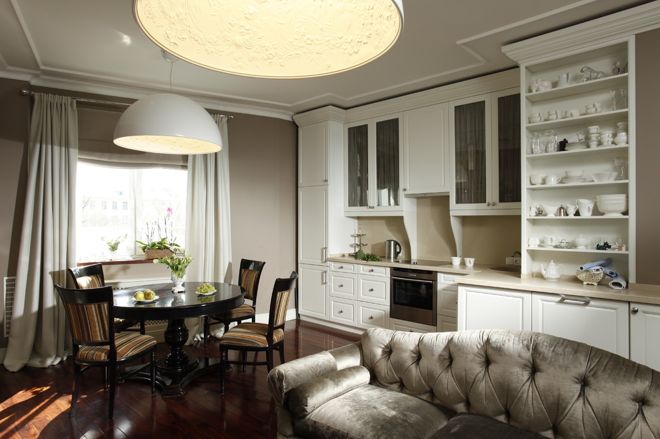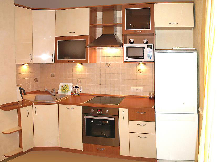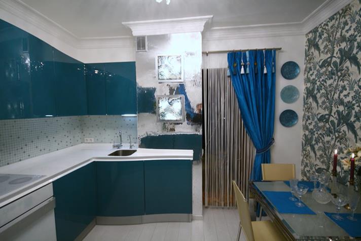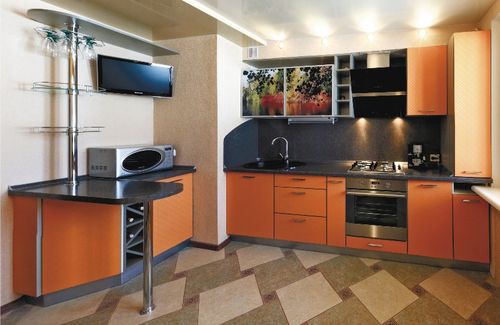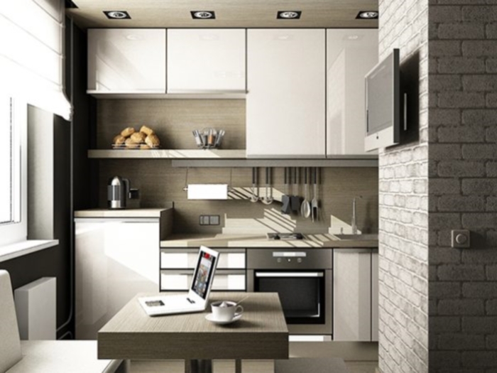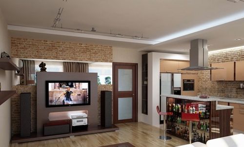 Tasarım, herhangi bir ekipman için ekstra bir yer olan bir TV standına dönüştürülerek ilginç görünüyor. Yerleşik mutfak setini doğru bir şekilde kurarsanız, gereksiz ayrıntılar görünmeyecektir.