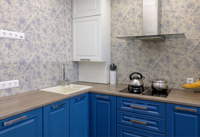 - Küçük bir mutfakta duvar kağıdı ile mobilya kombinasyonu