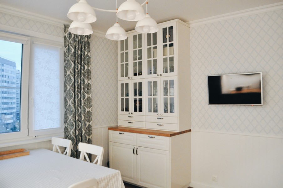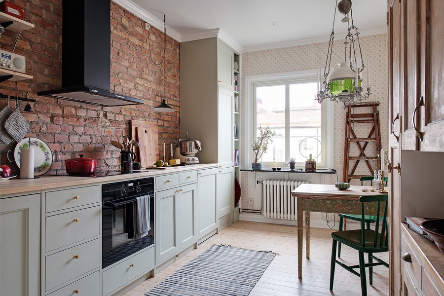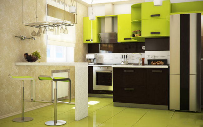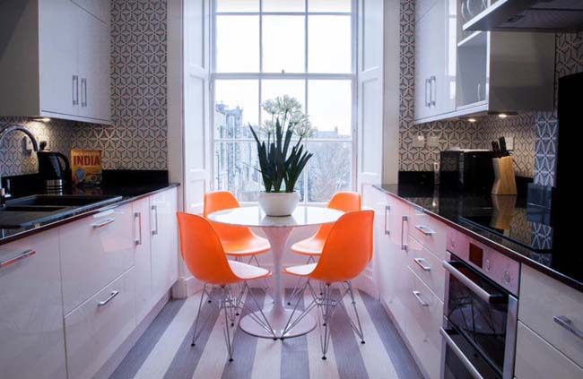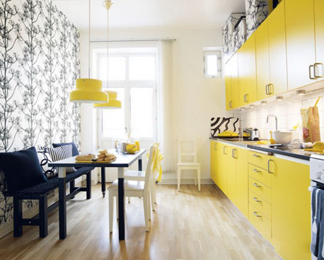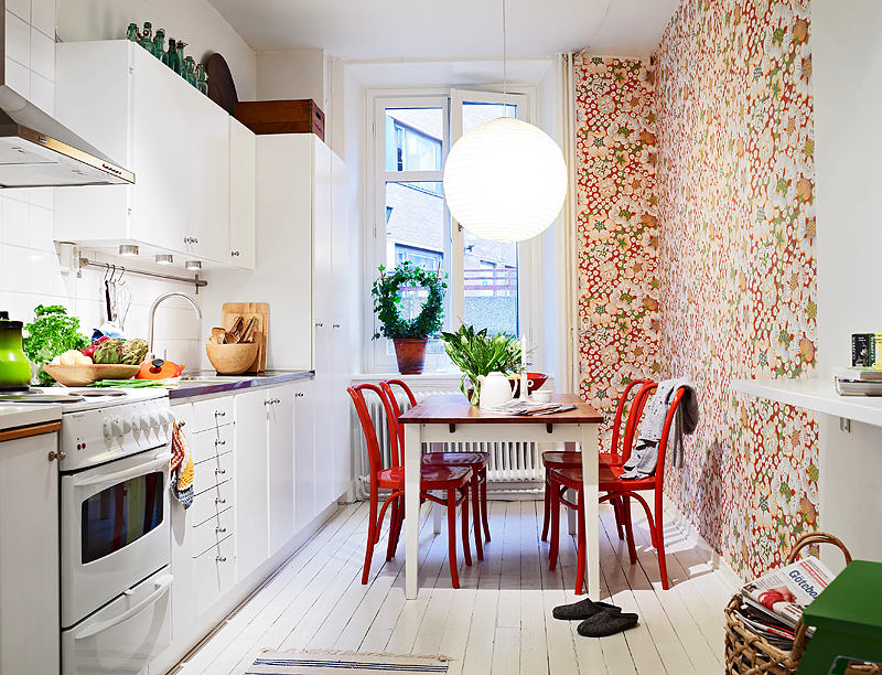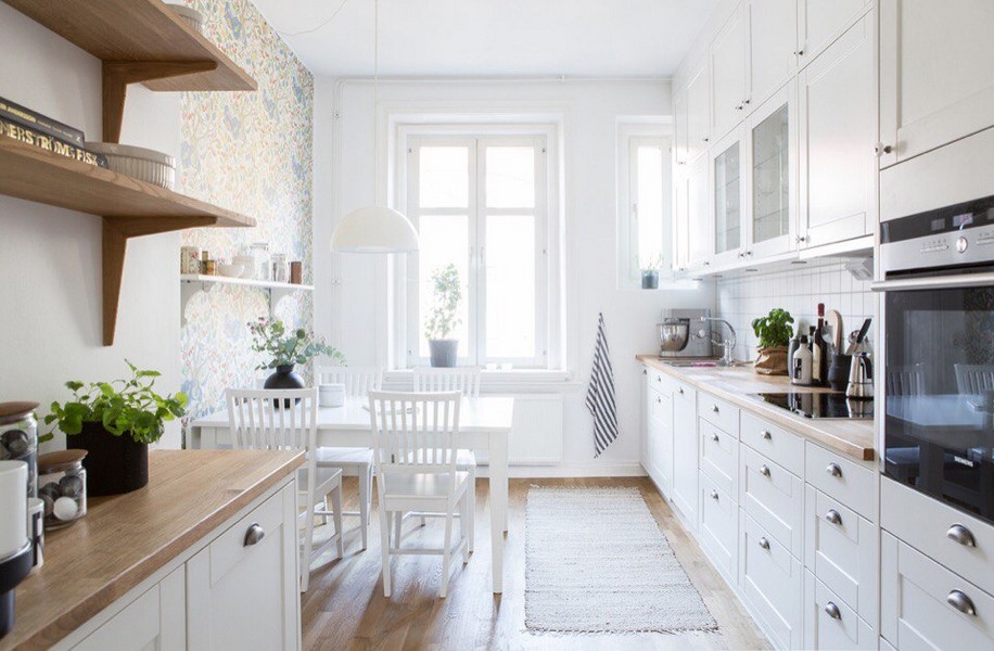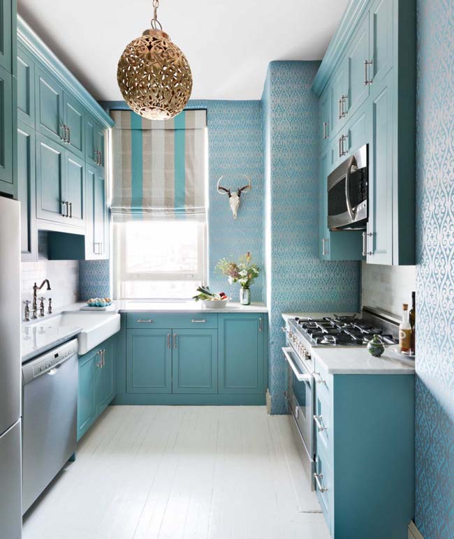 - Duvar kağıdı ile küçük bir mutfakta alanı görsel olarak genişletme