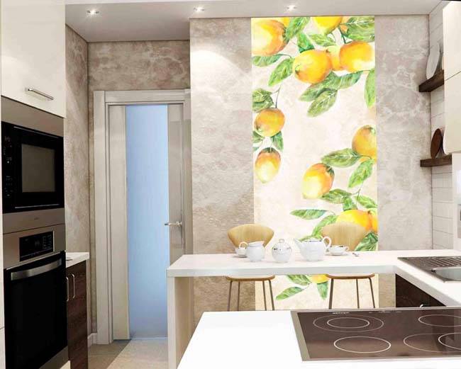 Soyut resimler kullanmak gerekli değildir. Çiçek, meyve, kahve ve diğer gıda ile ilgili motifler mükemmel kabul edilebilir. Tabii ki, yüksek kaliteli ve açık olmalıdırlar. Bununla birlikte, asıl şey, böyle bir süsdeki ölçüyü bilmek ve tüm alanla doldurmamaktır, aksi takdirde bir tıkanıklık hissi yaratılır.