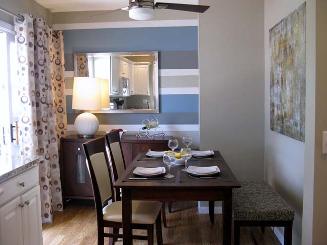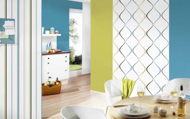 Bir odayı görsel olarak değiştirmenin oldukça ilginç bir yolu, duvar kağıdı deseni kullanarak bölgeleri ayırmaktır. En kolay seçenek, mutfağın bir kısmı yüksekliği diğeri genişliği arttığında çizgili bir süslemeyi birleştirmektir.