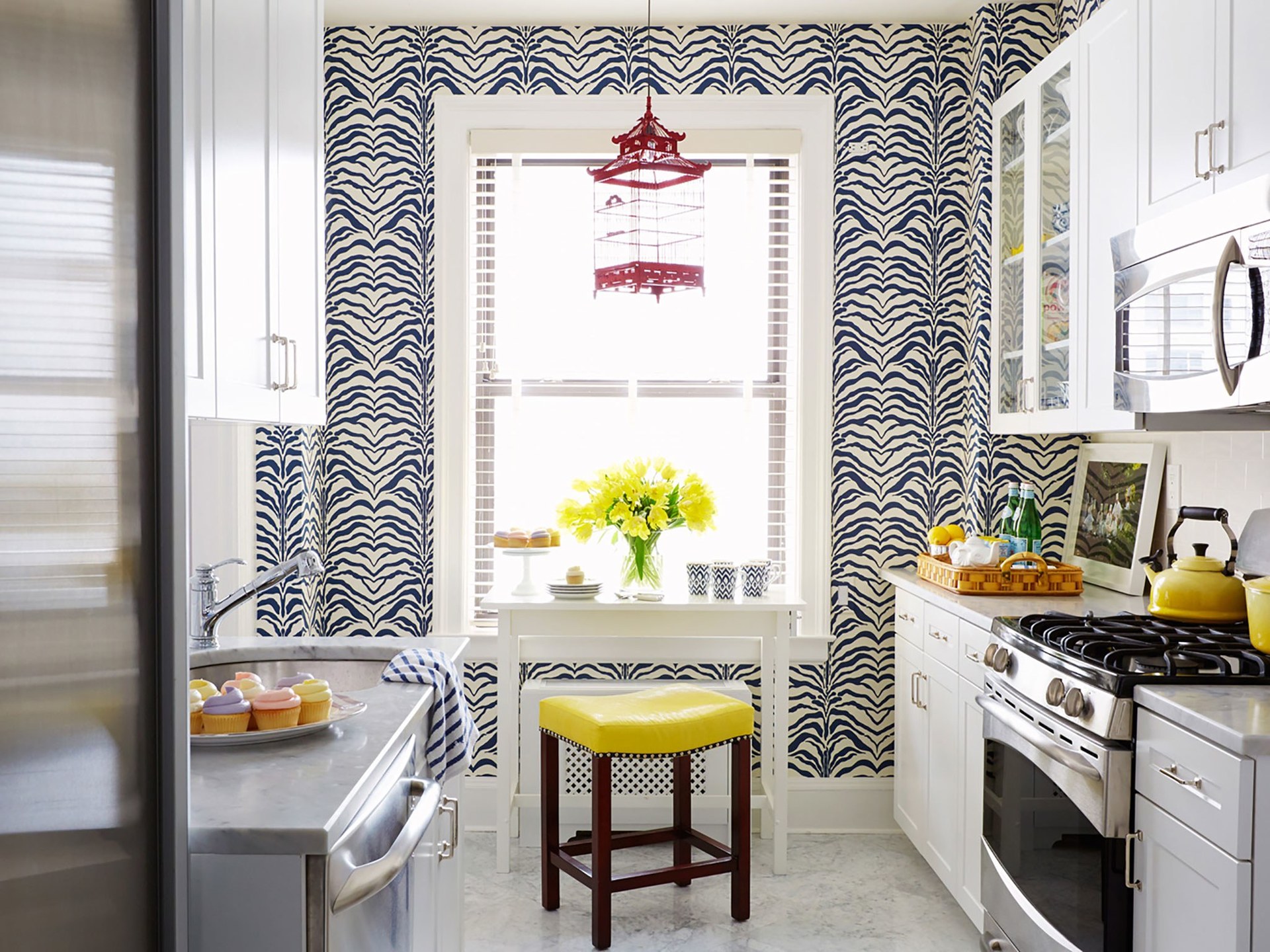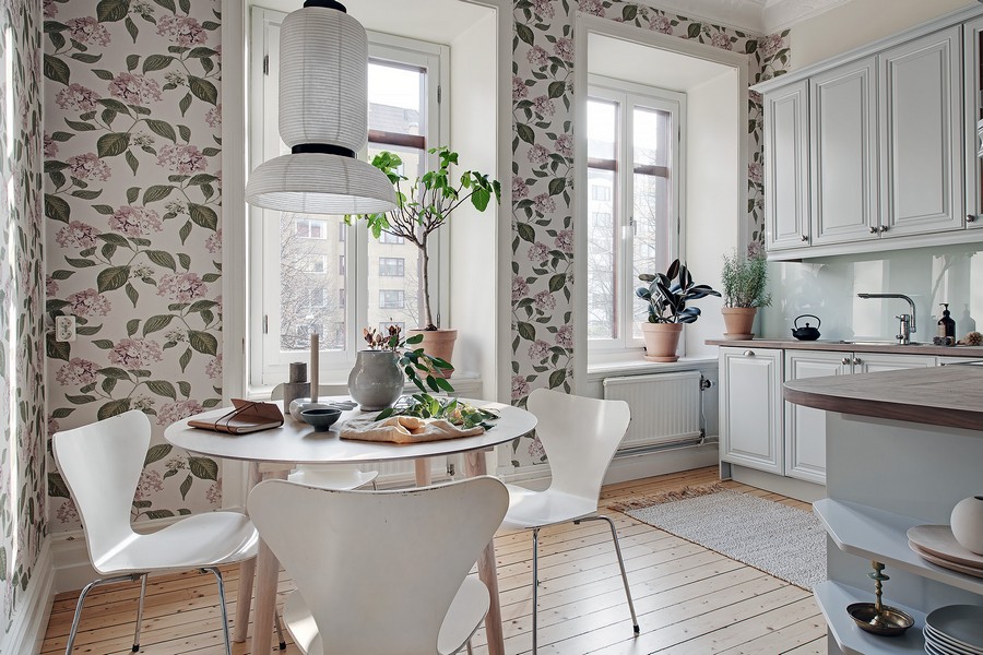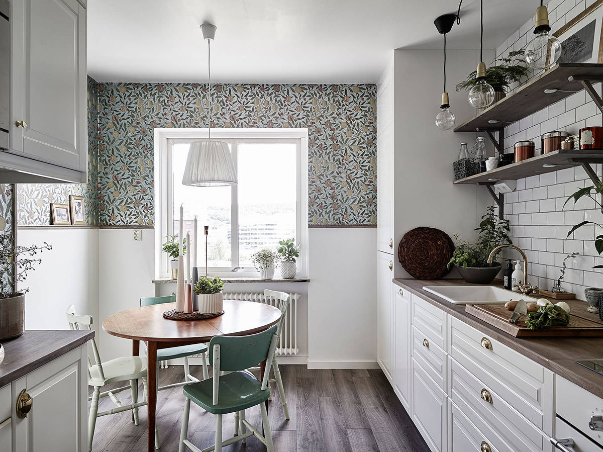 Duvar kağıdı ile küçük bir mutfakta alanı görsel olarak genişletme