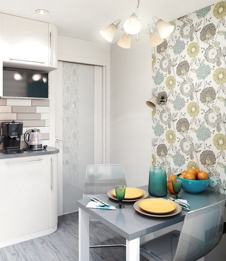 Küçük bir mutfakta duvar kağıdı ile mobilya kombinasyonu