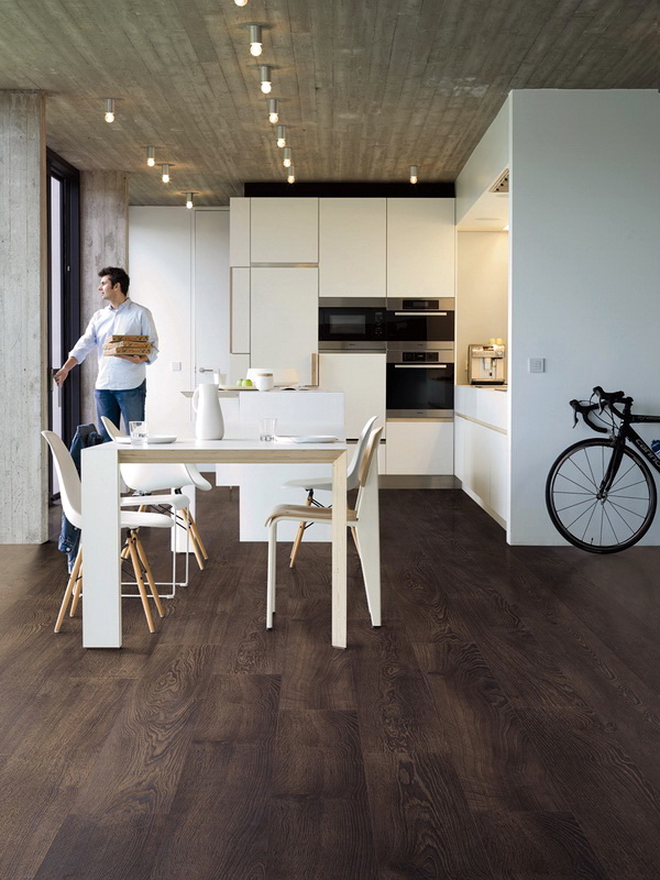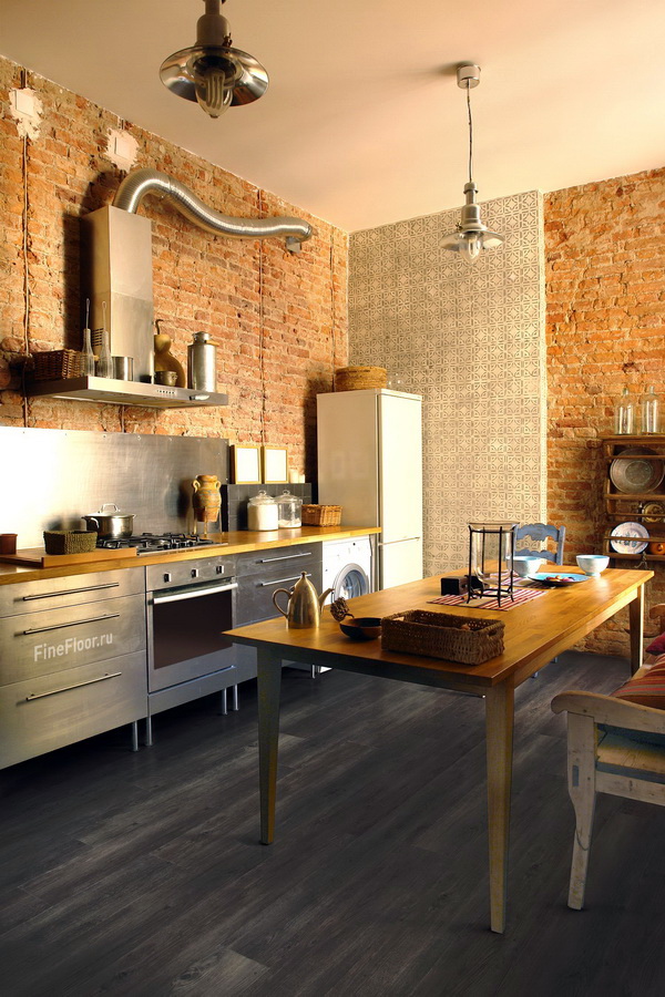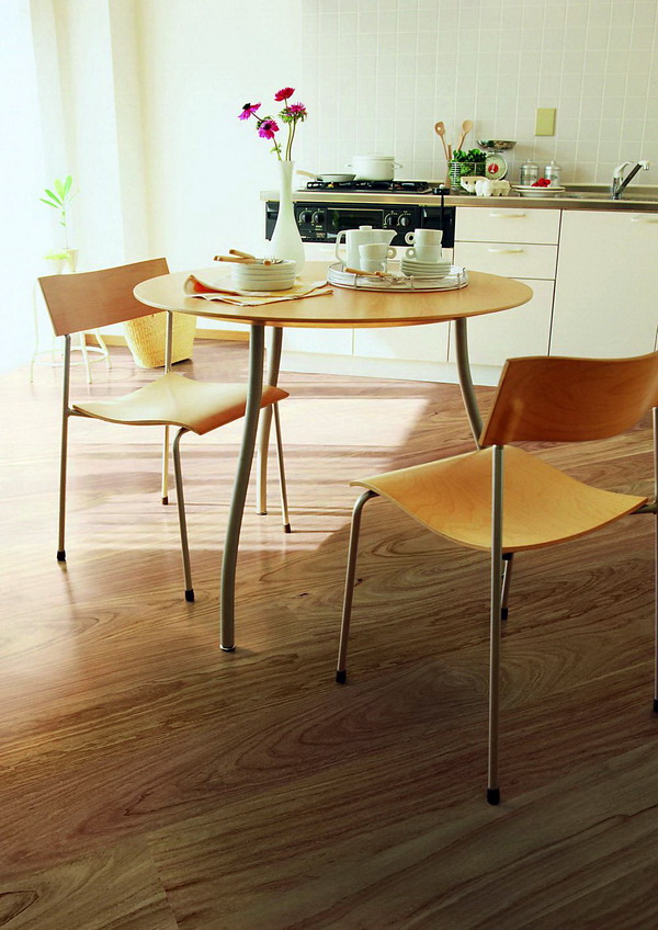 - Yüksek aşınma direnci. Yukarıda, mutfağın insanlar için favori bir yer olduğunu söylemiştik. Zemin alanına çok büyük bir mekanik negatif etki uygulanır. Sandalyenin bacakları çok fark edilir ve zaten geri dönüşü olmayan bir şekilde malzemeyi çizebilir, yanlışlıkla düşürülen bir plaka zarar verebilir. Ve bir günde bir yemek odasında çok fazla adım atan, hayal etmek korkunç olan insan bacaklarımızın etkisini küçümsemeyin.