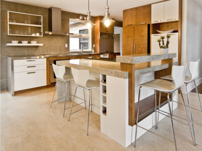 Linolyum her türlü mutfak için idealdir. Tek kılavuz mobilyaların renk şeması ve renkleri. Uzmanlar, farklı tonları birleştirmeyi ve odayı her birinin kendine ait bölgelere ayırmasını tavsiye ediyor.