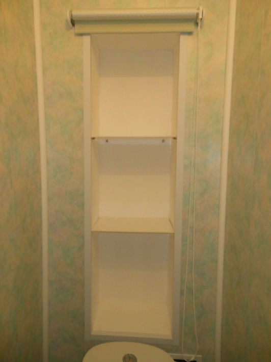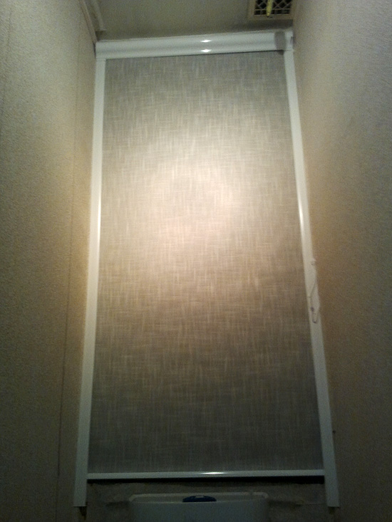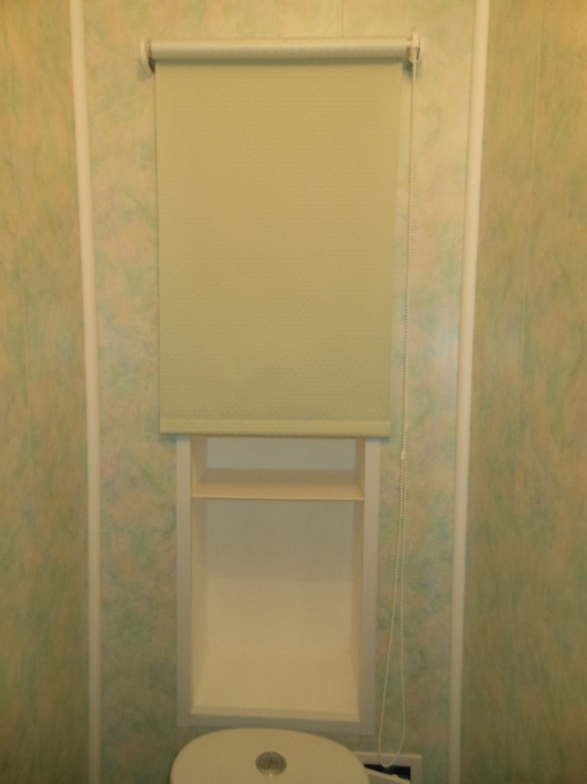 Tuvaletin arkasındaki tuvaletteki stor perdeler bir zincir kullanılarak temizlenir. Perde tabakası, banyo tavanına monte edilen kutuya dahil olan bir ruloya katlanır.