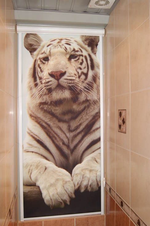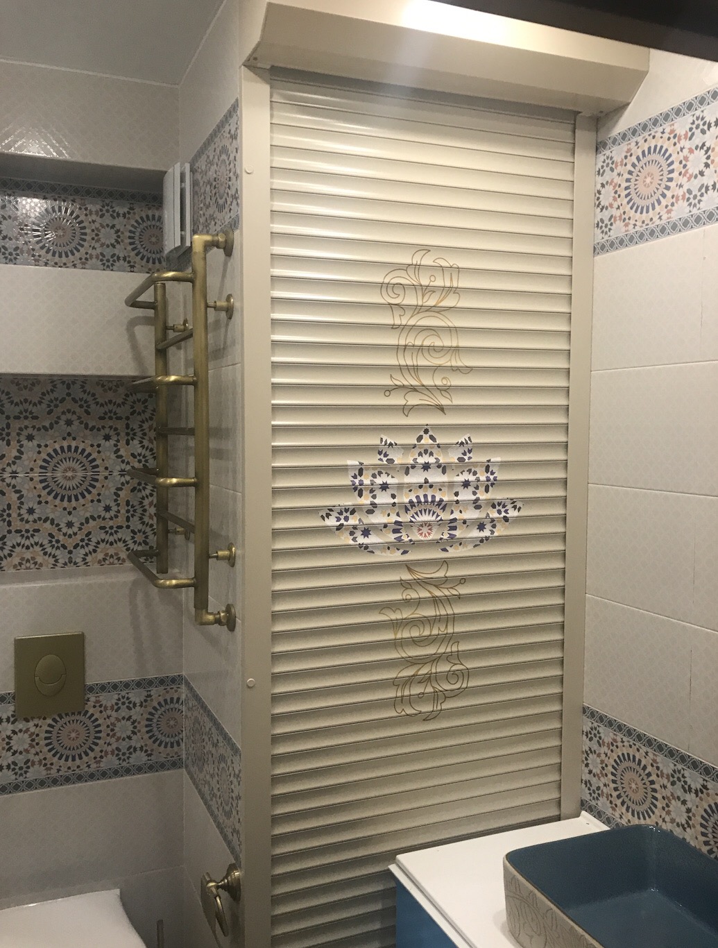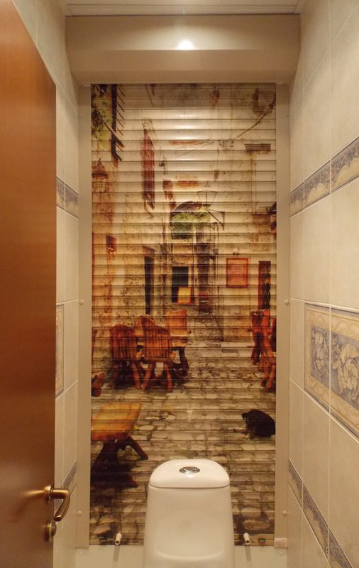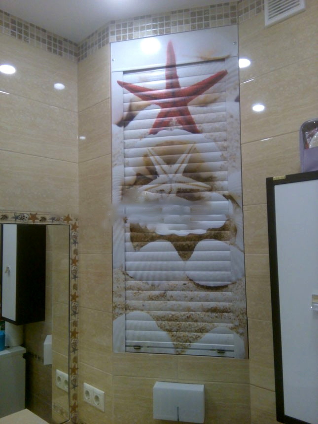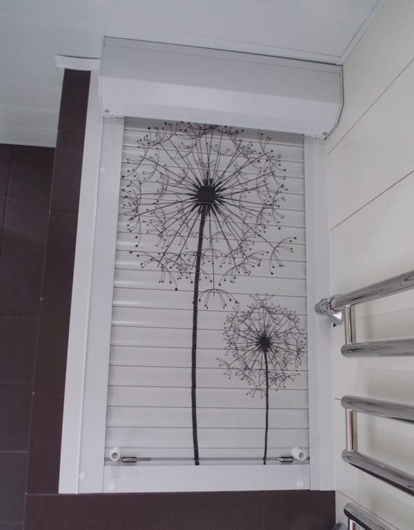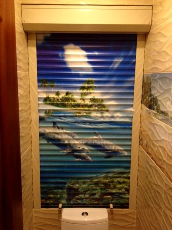 Roll-up perdeler için, baskı veya desen şeklinde uyarlanabilir dekor popülerdir.Fotoğraf baskısı ile tuvalette panjur kullanın. Ürünün daha fazla estetiği ve iç stilin bireyselliği için, perdeler ayrıca özel bir hava fırçası kullanılarak çeşitli görüntülerle dekore edilmiştir.