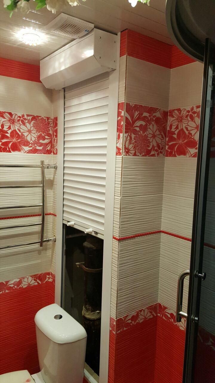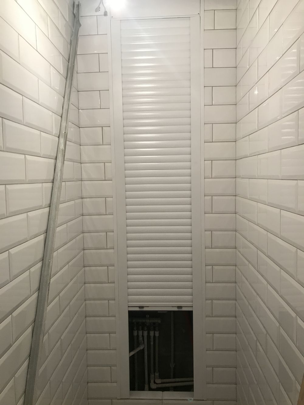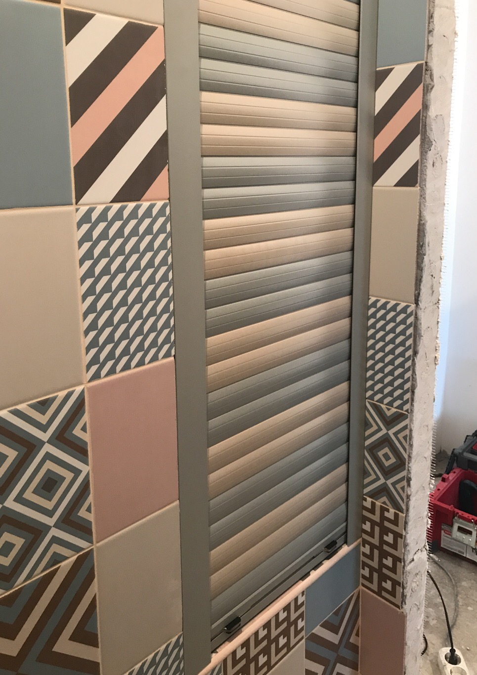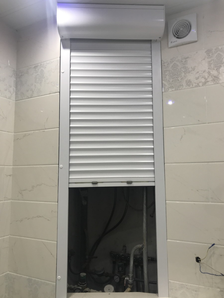 Açıklık dışında bir kutu ile ikinci görünüm. Bu yöntem, kutunun açıklığa dahil olmadığı bir durumda kullanılır. Ölçümler karo döşemesinin tamamlanmasından sonra yapılır; bağlantı elemanları doğrudan karo üzerine yapılır. Bu tasarımda açıklığın yüksekliğini hesaba katmak çok önemlidir, çünkü deklanşörü açarken yüksek yapılar için, açıklığı azaltan şaft üzerinde çok sayıda lamel dönüşü olacaktır.