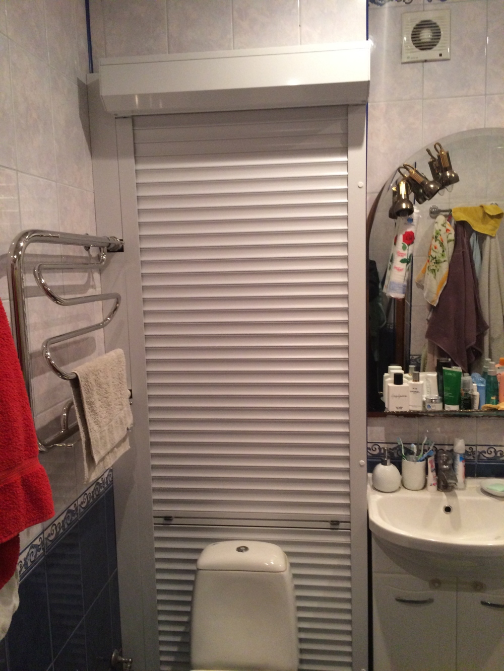 Rahat bir renk kombinasyonu ile banyo dolabındaki panjurları kolayca maskeleyebilirsiniz. Bu tür dolaplarda, ev kimyasallarını saklayabilir, kiler olarak kullanabilir veya tuvalette odanın görünümünü bozan boruları ve diğer mekanizmaları kapatmak için jaluzileri kullanabilirsiniz.