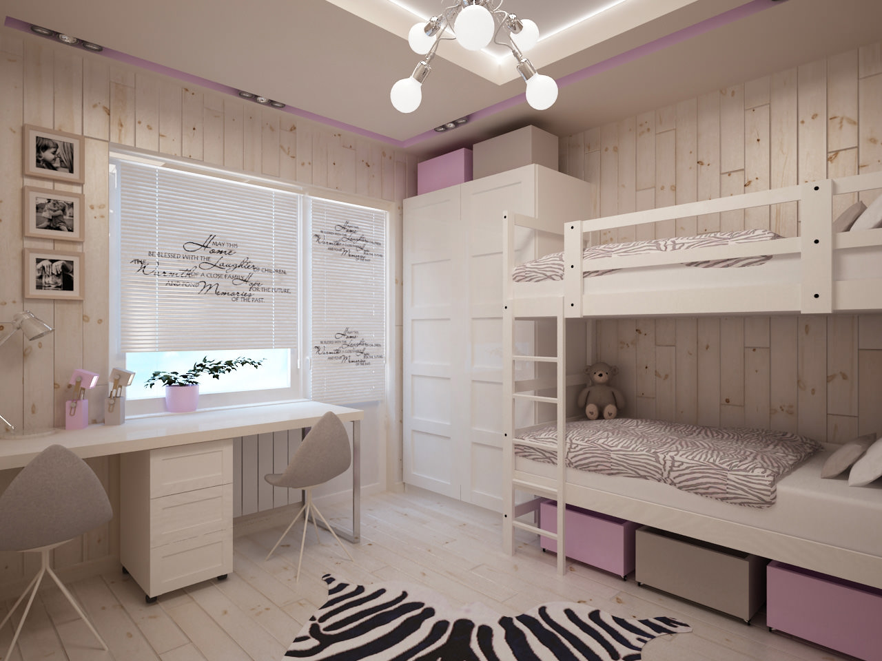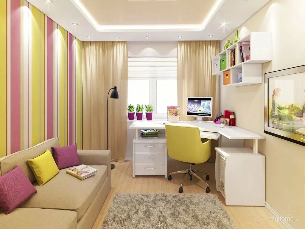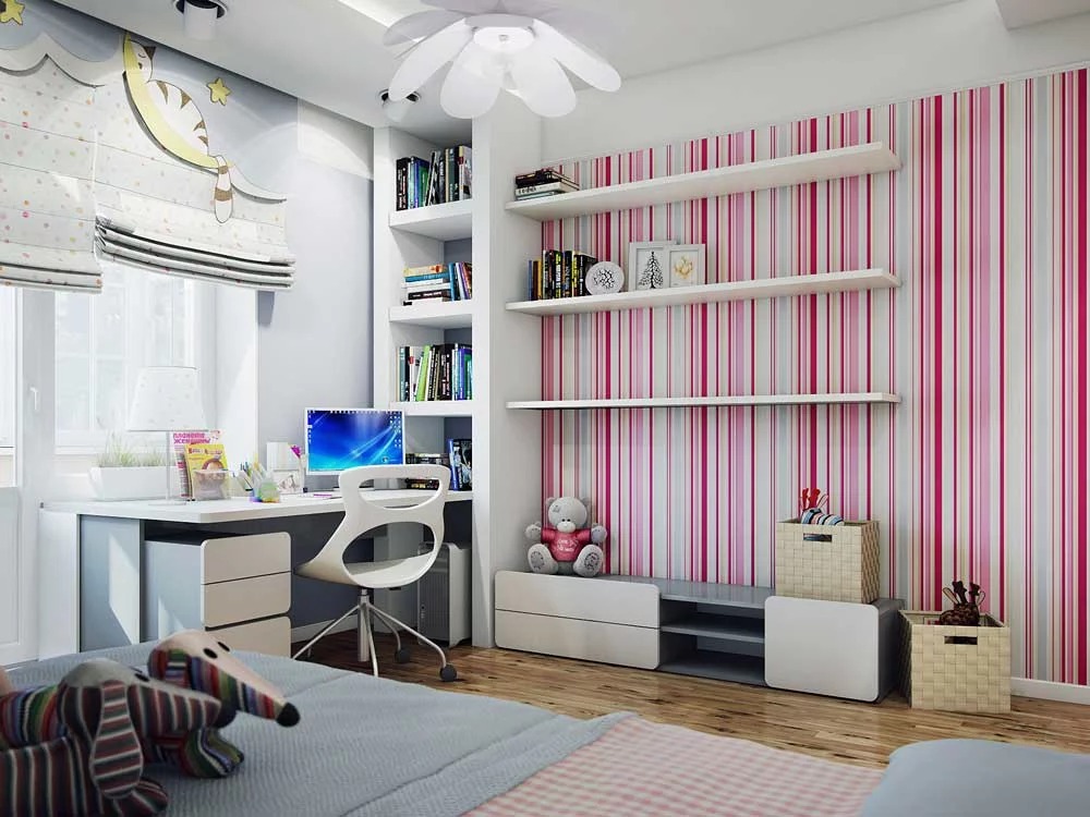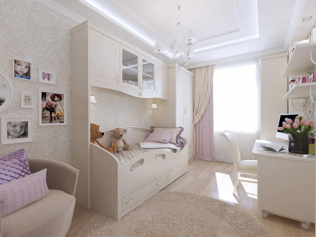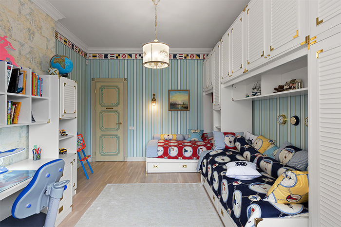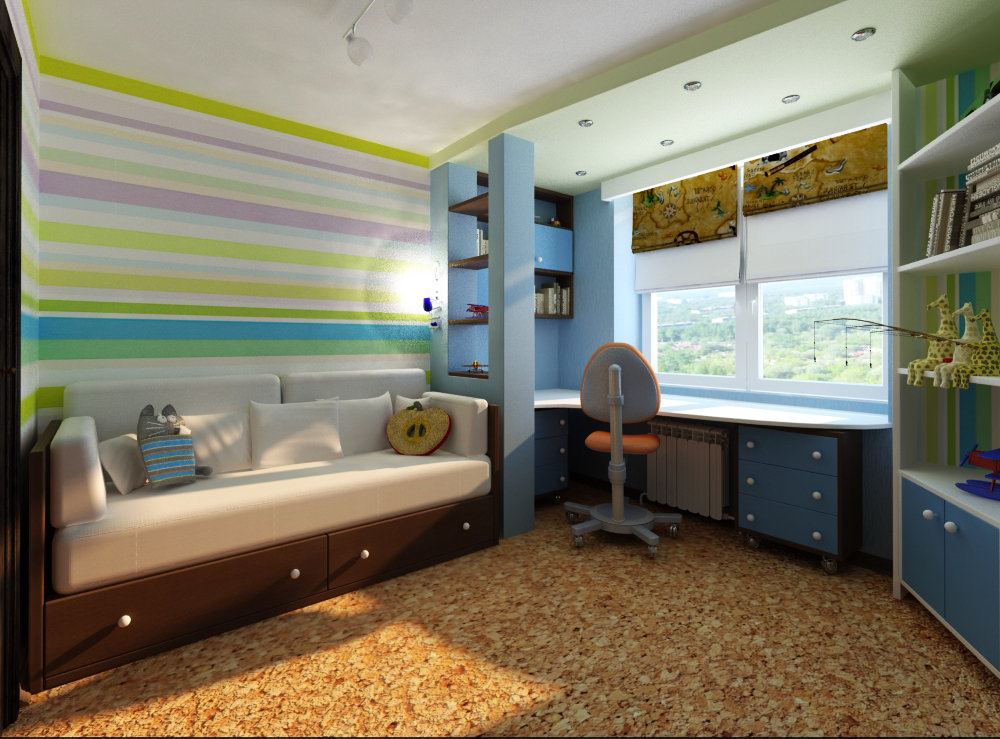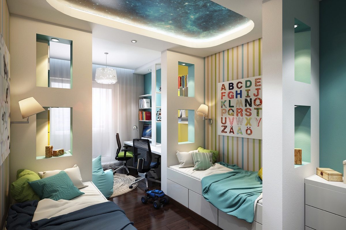 Một nơi lý tưởng để phân biệt giữa phòng ngủ của trẻ em là không gian giữa các giường. Kích thước của phòng là 14 sq. M. Điều này làm cho nó dễ dàng. Một giường tầng cũng có sẵn. Đồng thời, sự khác biệt có thể được thực hiện bằng cách trang trí khác nhau của các bức tường và trần nhà. Sử dụng một loạt các sắc thái màu sắc, họa tiết, cũng như các nhân vật trong truyện cổ tích - và nhà trẻ sẽ là một nơi tuyệt vời cho mọi đứa trẻ.