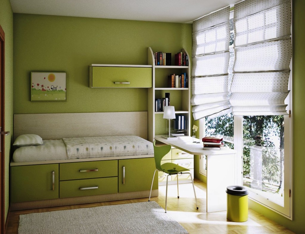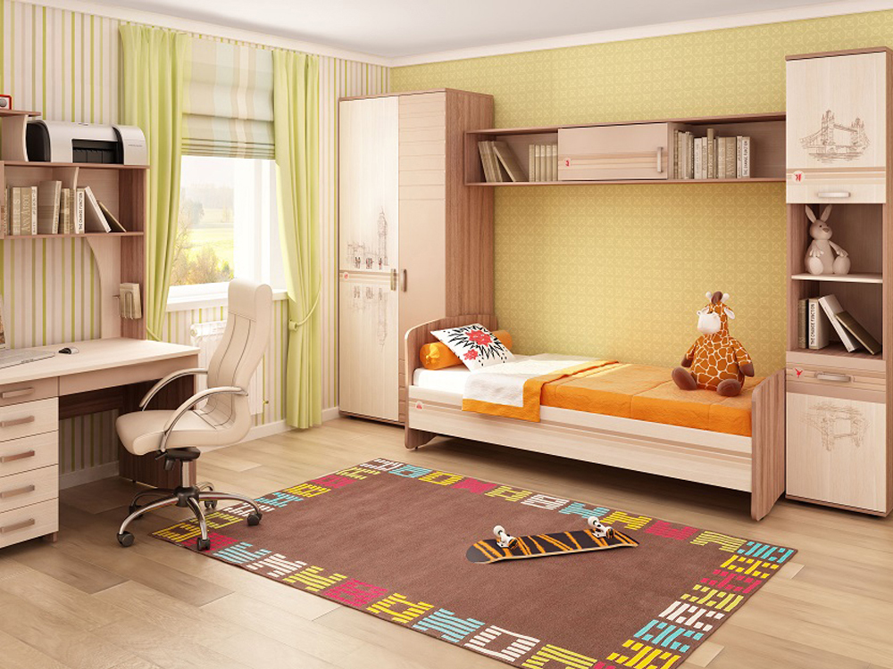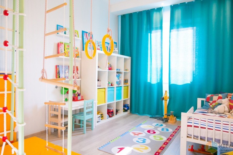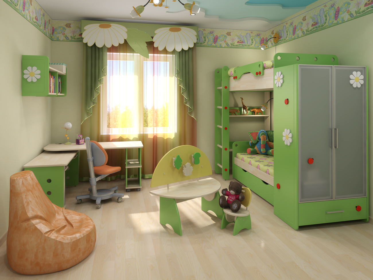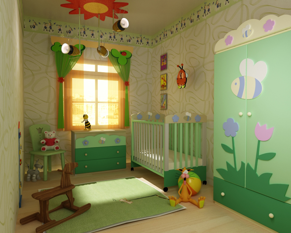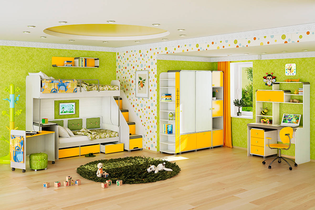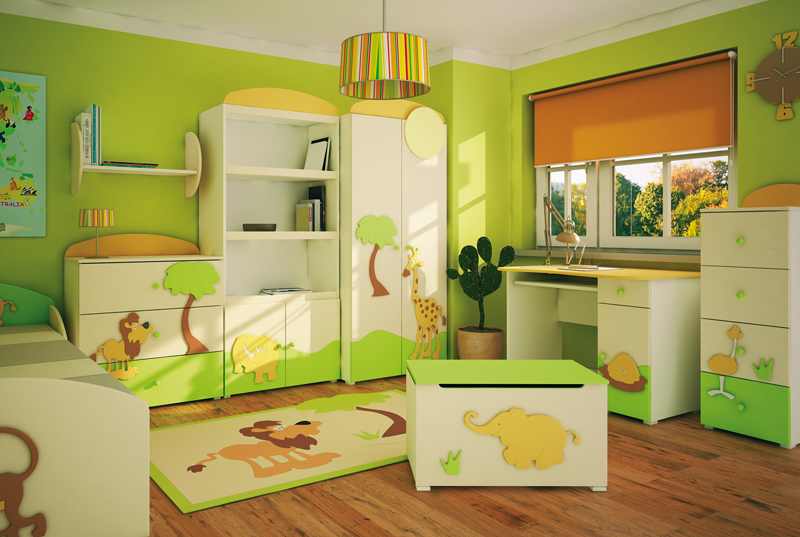 - Đặc biệt chú ý đến màu sắc. Ở đây, có lẽ, tính toán tuổi thực tế không hoạt động, vì gamma màu ảnh hưởng đến mọi người như nhau, bất kể tuổi tác của họ. Điều quan trọng là chọn màu sáng không gây ra tâm trạng bi quan chán nản. Điều duy nhất phù hợp hơn cho con trai là gamma xanh lục, trong khi đối với con gái bạn có thể sử dụng tông màu vàng đào. Nếu căn phòng được thiết kế cho trẻ em dị tính, thì cha mẹ nên chú ý đến các sắc thái phổ quát như gam màu tím hoa cà và màu cát vàng.