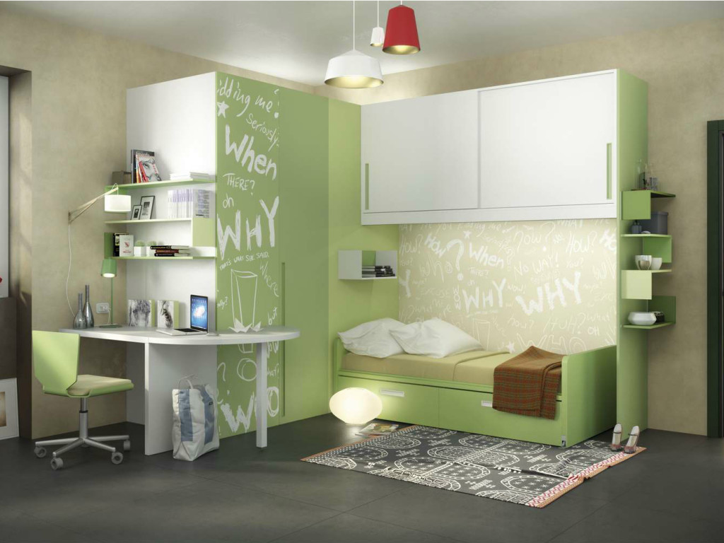 Một tủ góc là lý tưởng cho một căn phòng nhỏ. Nó không chiếm nhiều không gian, nhưng đồng thời nó cho phép bạn đặt mọi thứ bạn cần bên trong. Đứa trẻ trong trường hợp này sẽ không bị chuột rút ở giường phụ.