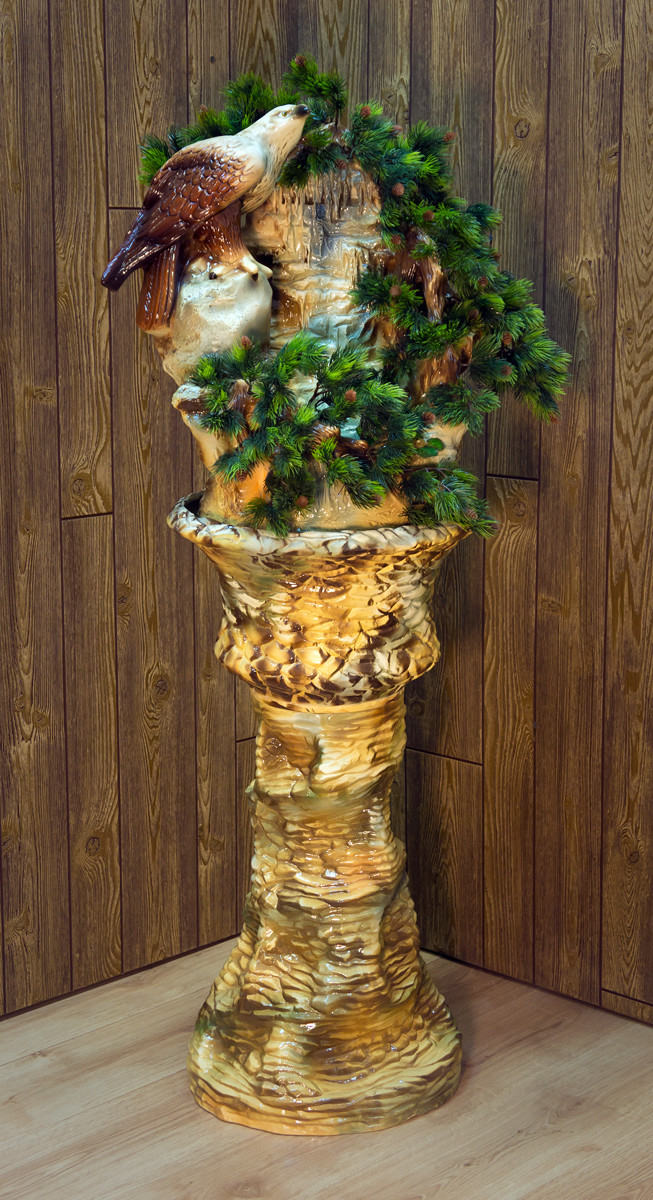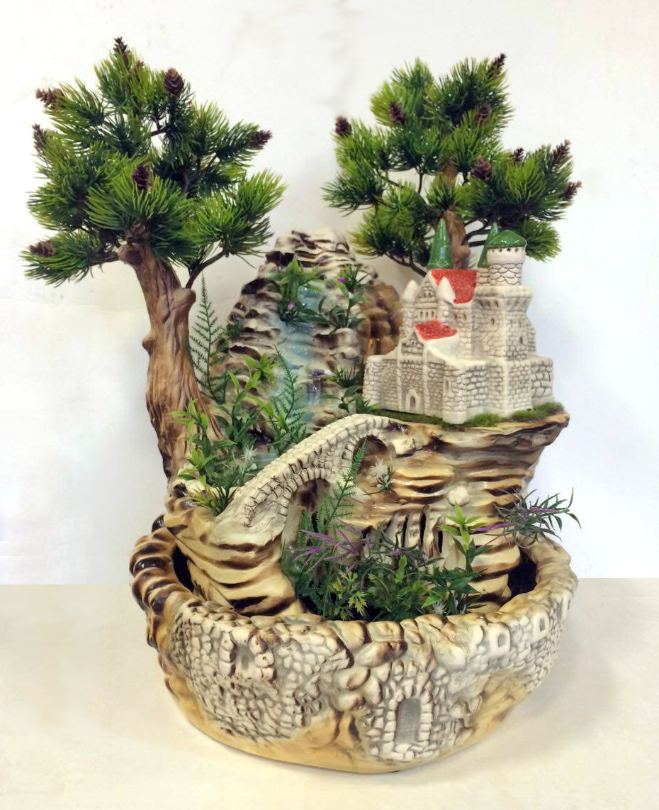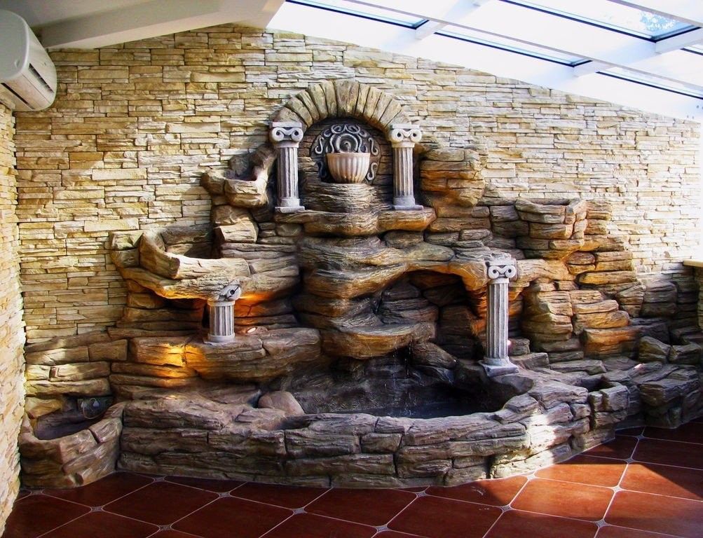 Đá nhân tạo phổ biến nhất, đài phun nước làm bằng nó phù hợp với nội thất hiện đại cổ điển và có nhiều lựa chọn thiết kế. Nó có thể là: hang động nhỏ, thác nước, hang động hoặc cây cảnh nhân tạo. Thường thì chúng được trang bị ánh sáng tưởng tượng, mang lại sự lãng mạn và sang trọng hơn cho căn phòng. Thiết kế trang trí công phu của những vật dụng như vậy phù hợp hơn cho khu nhà ở với nội thất cổ điển: phòng ngủ và phòng khách.