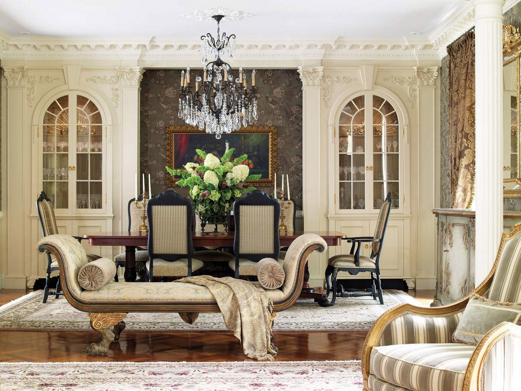 Chu vi của căn phòng theo phong cách cổ điển nhất thiết phải được trang trí với trần nhà, đèn chùm được treo trên các hốc trang trí