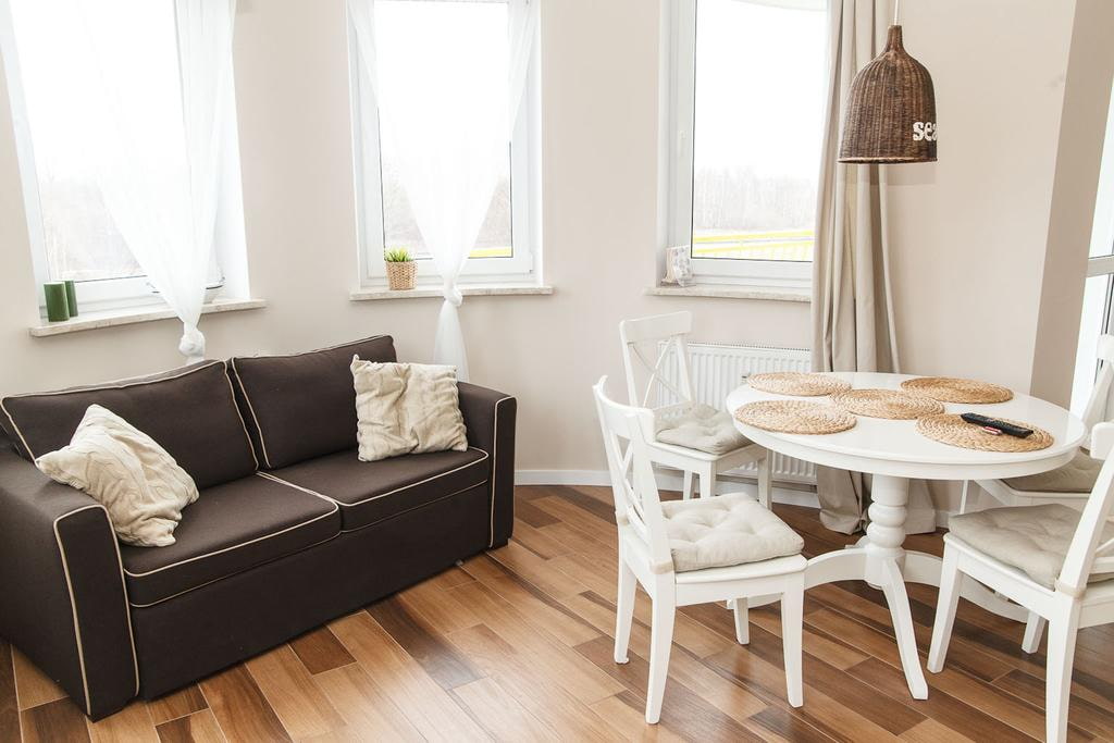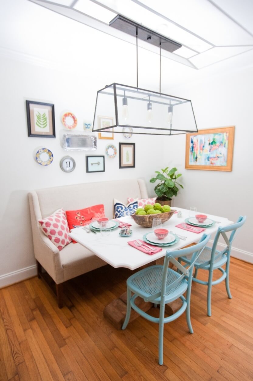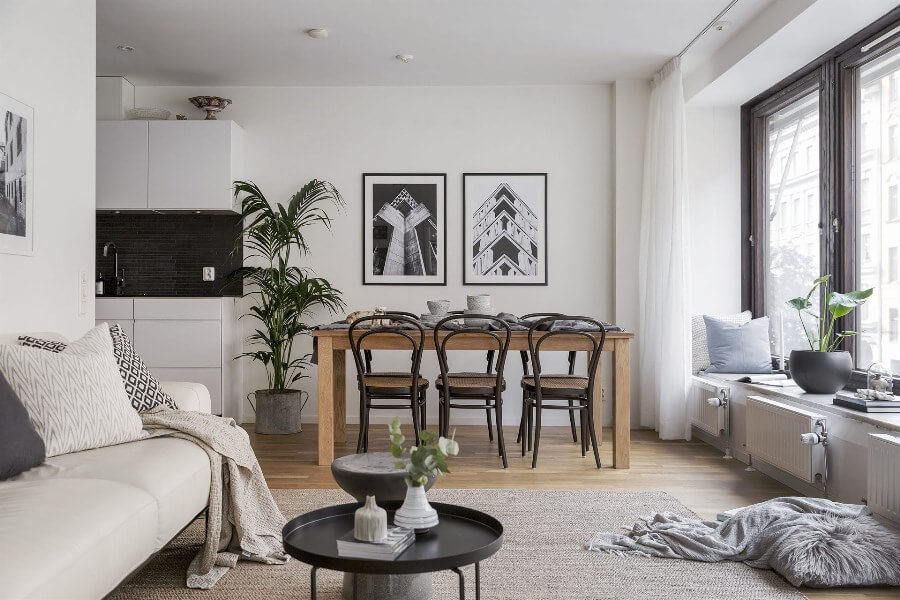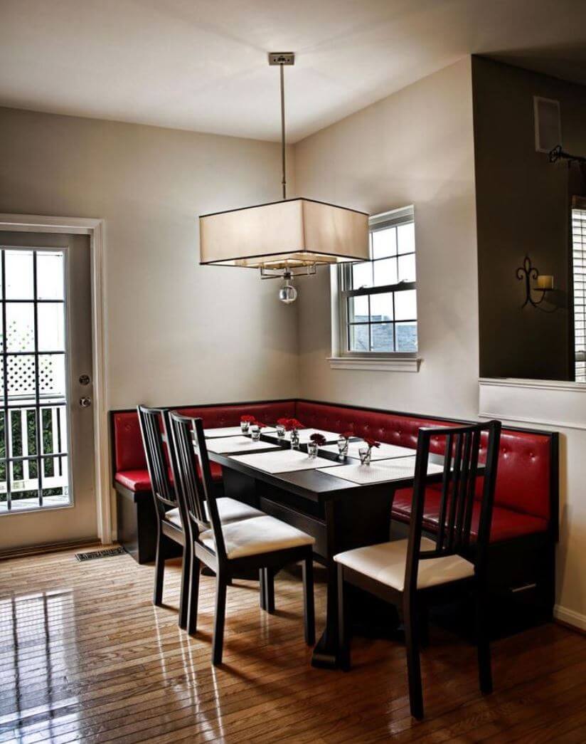 Một chiếc ghế sofa nhỏ trong khu vực ăn uống là giải pháp tiêu chuẩn cho một căn phòng khiêm tốn