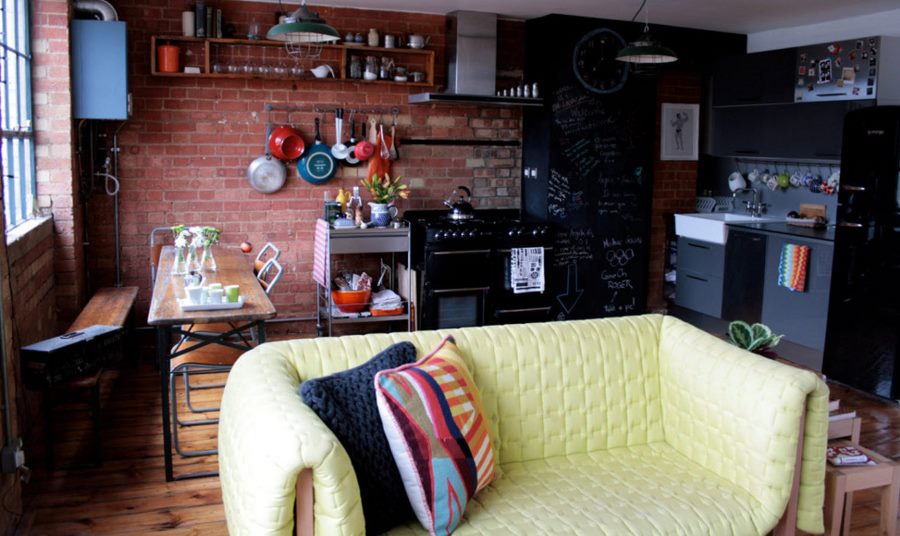 Sofa nhỏ gọn màu vàng trong phòng khách nhà bếp kiểu công nghiệp