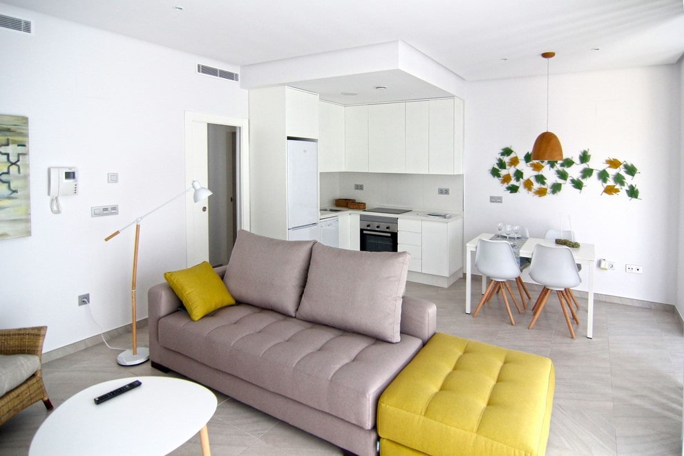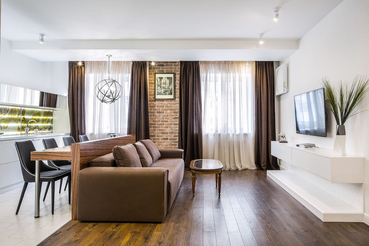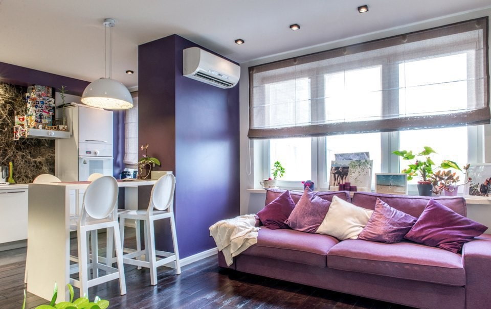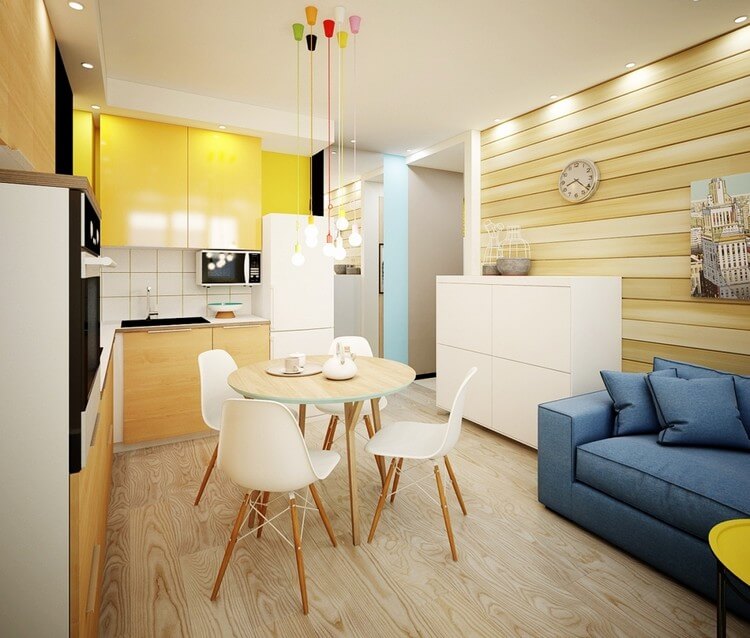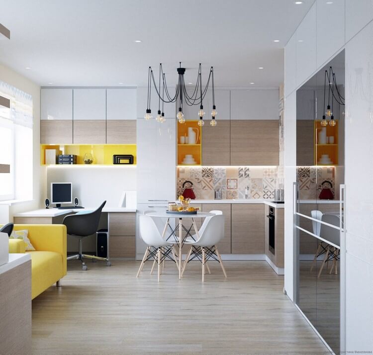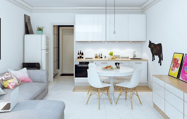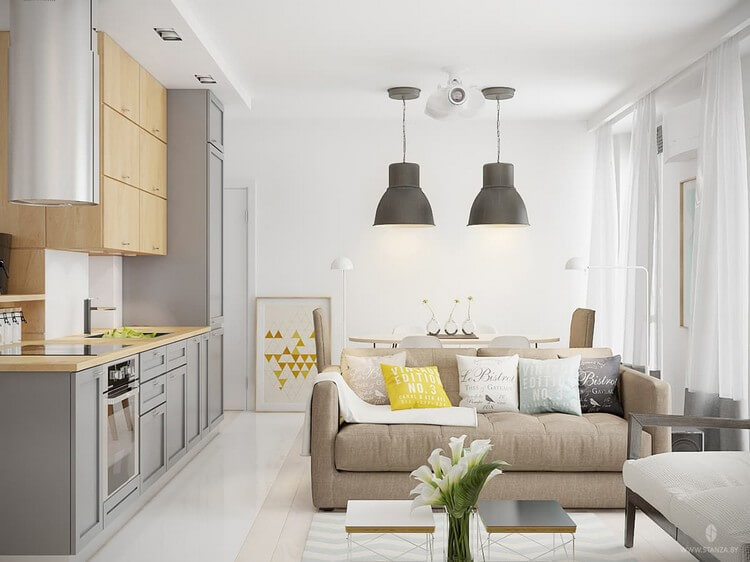 Nên lắp đặt ghế sofa trên đường viền tưởng tượng giữa nhà bếp và phòng khách. Đây là sự sắp xếp nội thất phổ biến nhất được tìm thấy trong các căn hộ studio.
