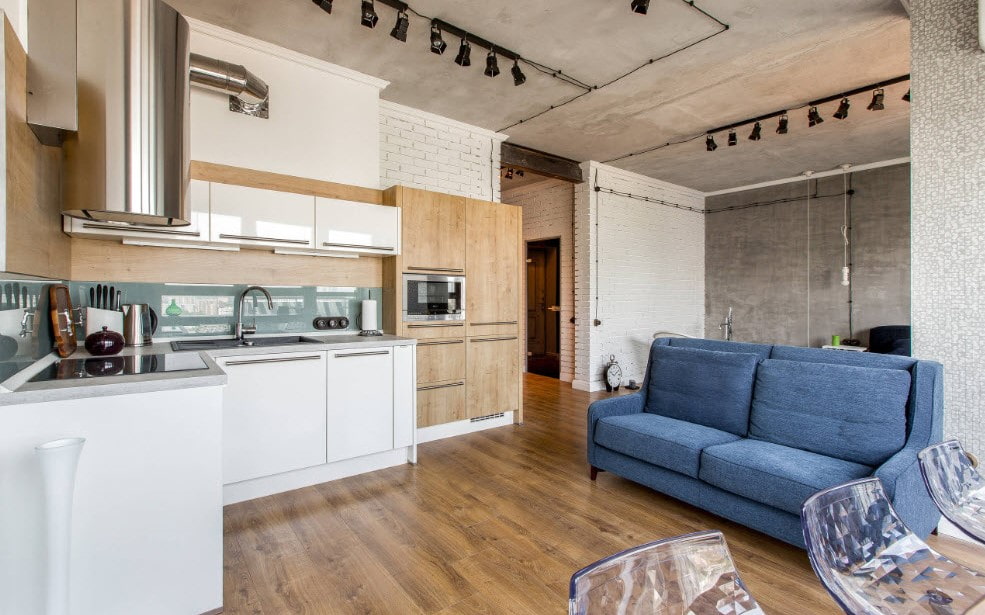 - Tính hai mặt của phong cách. Trong trường hợp này, nhà bếp "mặc quần áo" với tông màu khác với phòng khách. Một hiệu ứng phân vùng được tạo ra mà không sử dụng ranh giới rõ ràng.