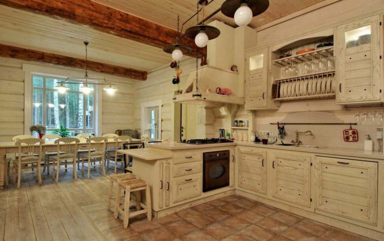 Trong thiết kế của một ngôi nhà gỗ mộc mạc, điều quan trọng là giữ gìn sự lãng mạn mộc mạc, nhấn mạnh sự tự nhiên. Để đạt được hiệu ứng này, phong cách của Provence, đất nước sẽ giúp đỡ. Provence được đặc trưng bởi sự dịu dàng, cái nhìn lâu đời của đồ nội thất. Nếu đồ nội thất của bà nội còn lại trong nước, bạn không cần phải vứt nó đi. Tốt hơn là khôi phục các đối tượng, sơn chúng theo đúng màu. Phong cách Provence được chào đón ánh sáng.