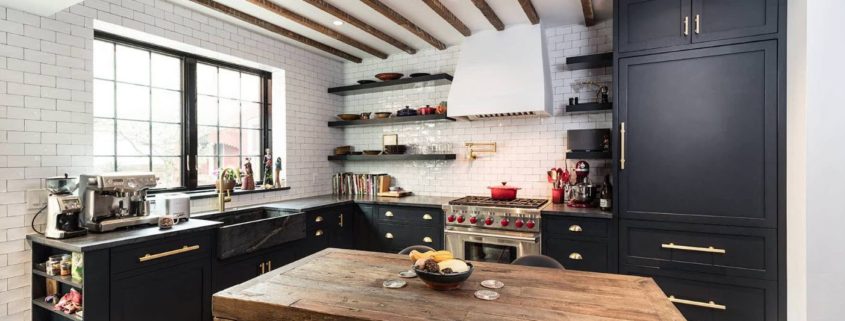 Nội thất nhà bếp màu đen và trắng bất thường trong một ngôi nhà nông thôn