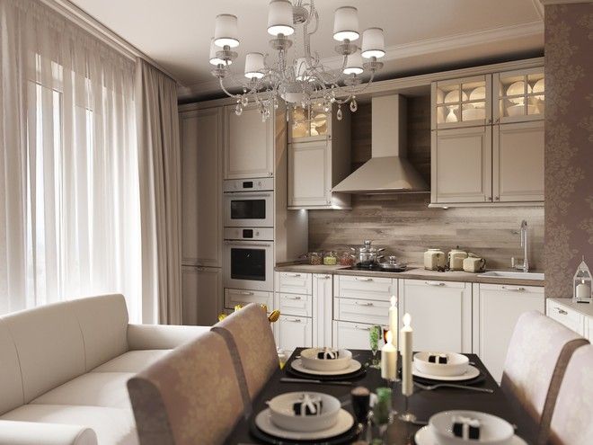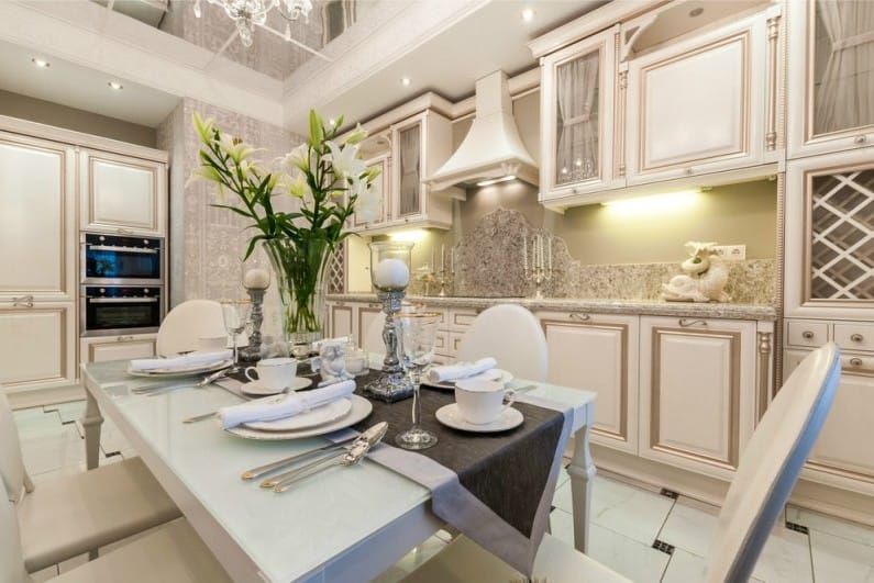 Trang trí đóng một vai trò quan trọng trong việc tạo ra nội thất. Phong cách cổ điển hiện đại của nhà bếp ngụ ý sự kiềm chế và hài hòa trong tất cả các chi tiết của bộ đồng phục. Do đó, vữa, tranh trong khung gỗ, phụ kiện nhỏ. Tiêu chí chính là sự tuân thủ tính đối xứng.