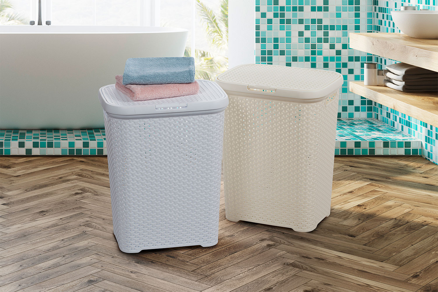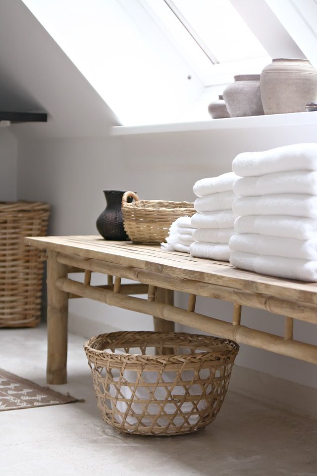 Giỏ đan lát truyền thống trông trung tính và phù hợp với bất kỳ nội thất phòng tắm.