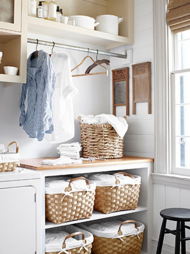Theo quy định, ở nông thôn, mọi thứ để giặt được tích lũy nhanh hơn: đôi khi điều này là do cả gia đình đã tụ tập ở trong nước, và đôi khi do thực tế là có nhiều hoạt động hơn sau đó mọi thứ được gửi đi để rửa. Vì lý do này, khối lượng container nên lớn hơn. Để không chiếm nhiều không gian trong phòng tắm, những thùng chứa này có thể được đặt dưới cầu thang. Một lựa chọn khác là đặt các thùng chứa lớn trên máy giặt hoặc dưới bồn rửa. Trong trường hợp này, các giỏ sẽ đứng ở một vị trí nổi bật, điều đó có nghĩa là bạn sẽ cần phải quan tâm rằng thiết kế phù hợp với phong cách của căn phòng, và nói chung vẻ ngoài của giỏ là thẩm mỹ.