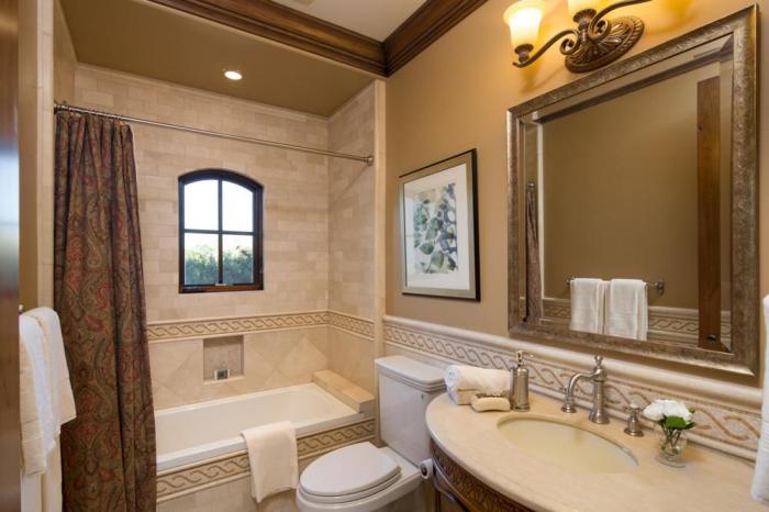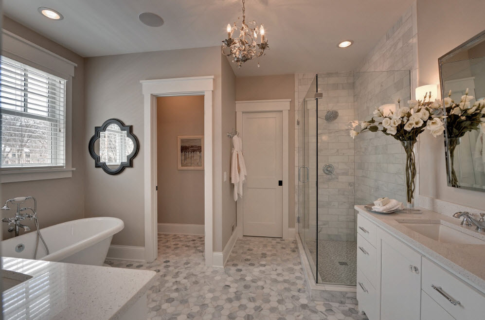 Hoàn thiện trong phòng tắm được thực hiện tốt nhất trong các màu pastel nhẹ với các điểm nhấn nhẹ.