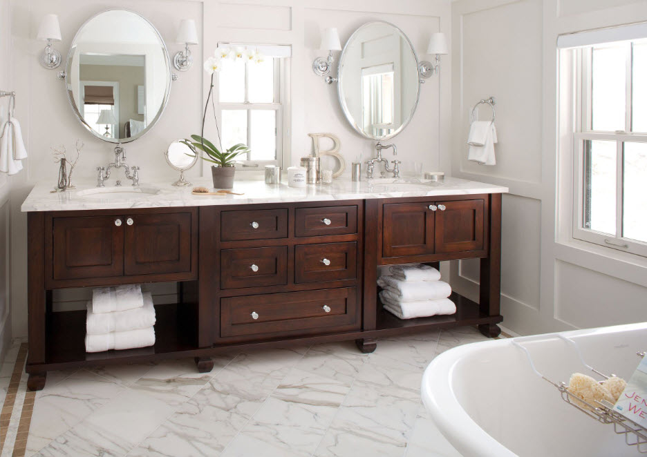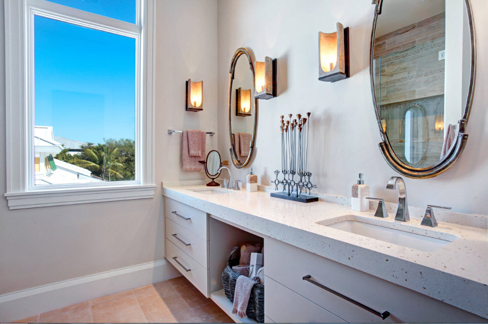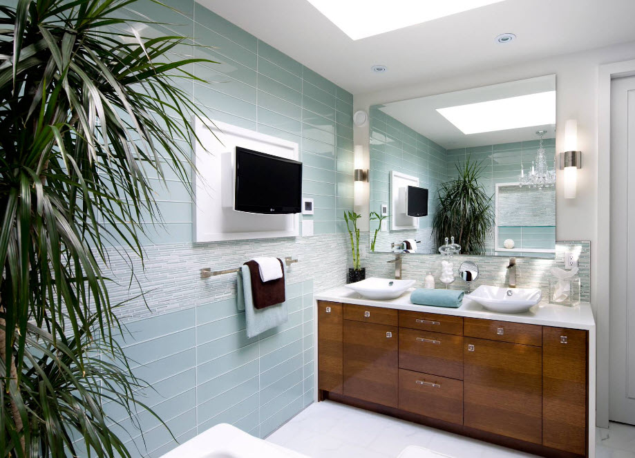 Các nhà sản xuất cung cấp một tấn các tùy chọn đồ nội thất sẽ phù hợp với bất kỳ phong cách và màu sắc của thiết kế phòng tắm. Khi chọn đồ nội thất, hãy dựa vào công thái học của nó. Tốt hơn là chọn tủ hẹp đa cấp với mặt kính và gương. Kệ mở phía trên bồn rửa được mua tốt nhất trong thiết kế kính.